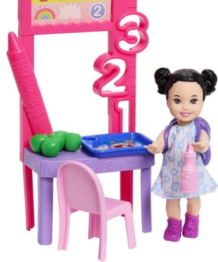 Sættet indeholder en Barbie-dukke i sød kjole, en lille elevdukke, stol, rygsæk, bakke, lim, bog, plysbamse og andet skoleudstyr. Med let håndterbare tilbehør og aftagelige dele er legen nem og sjov for børn fra 3 år.