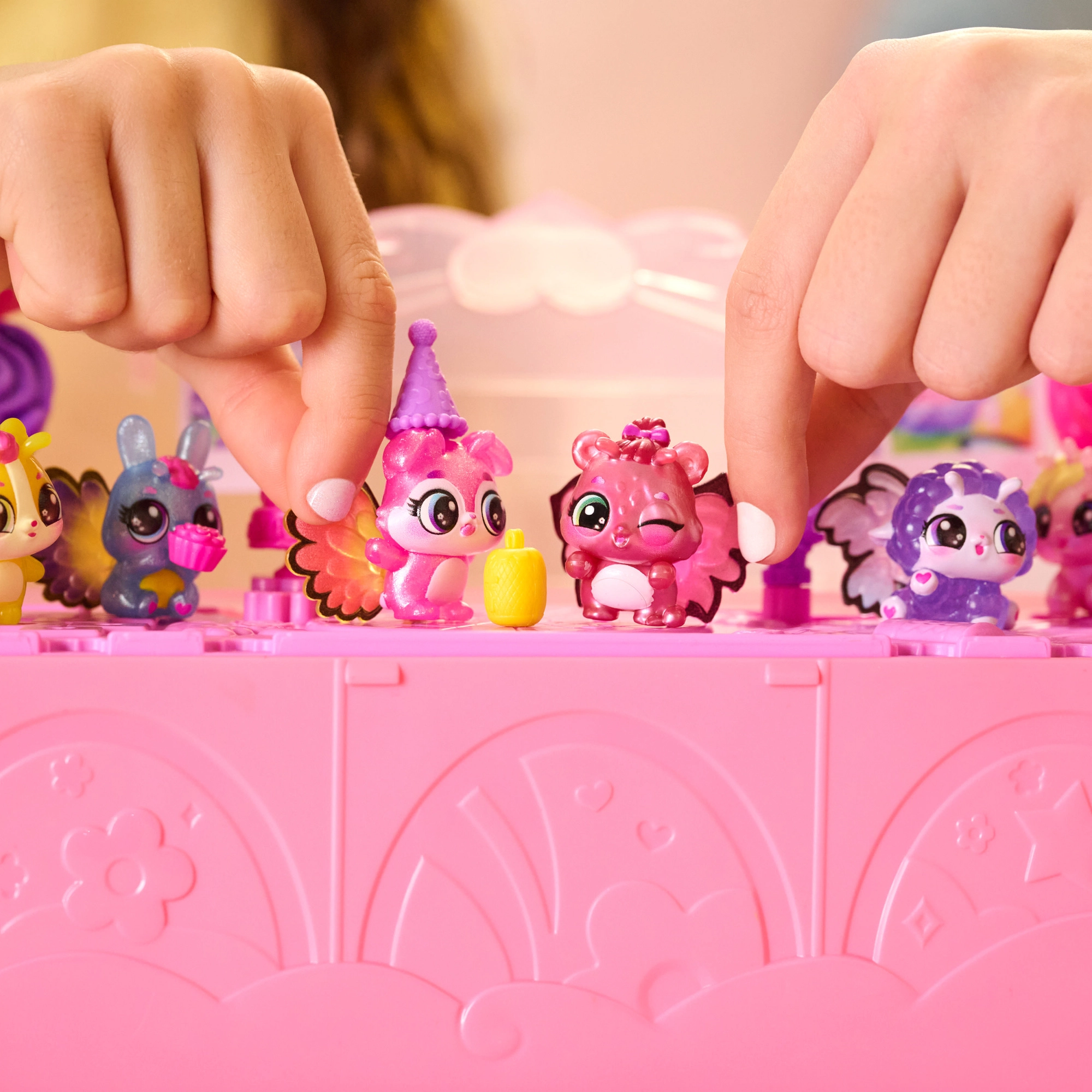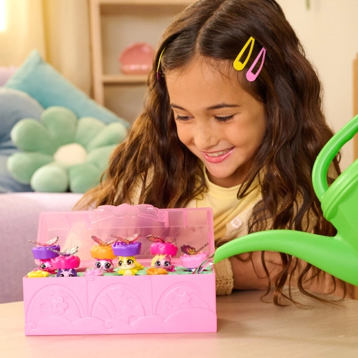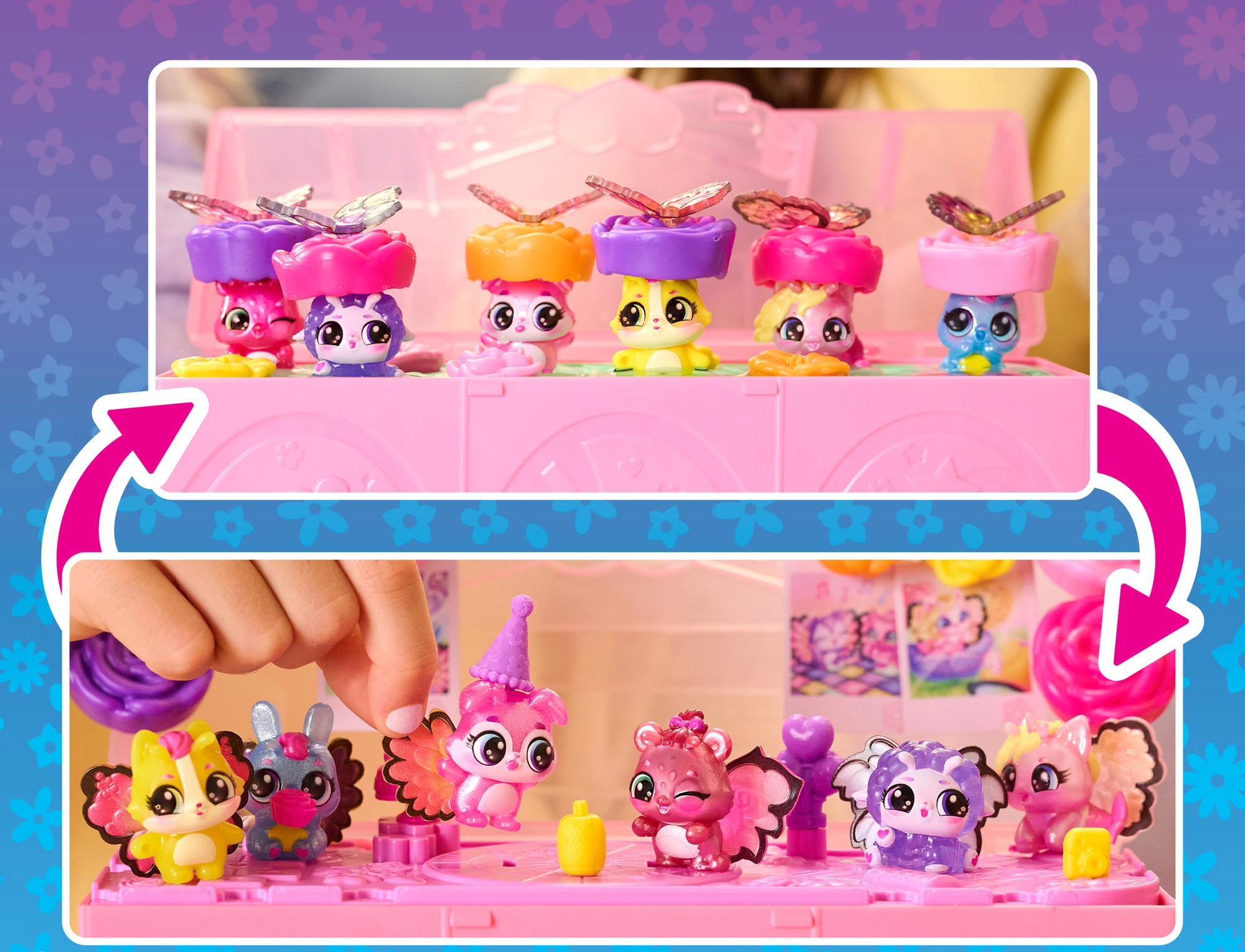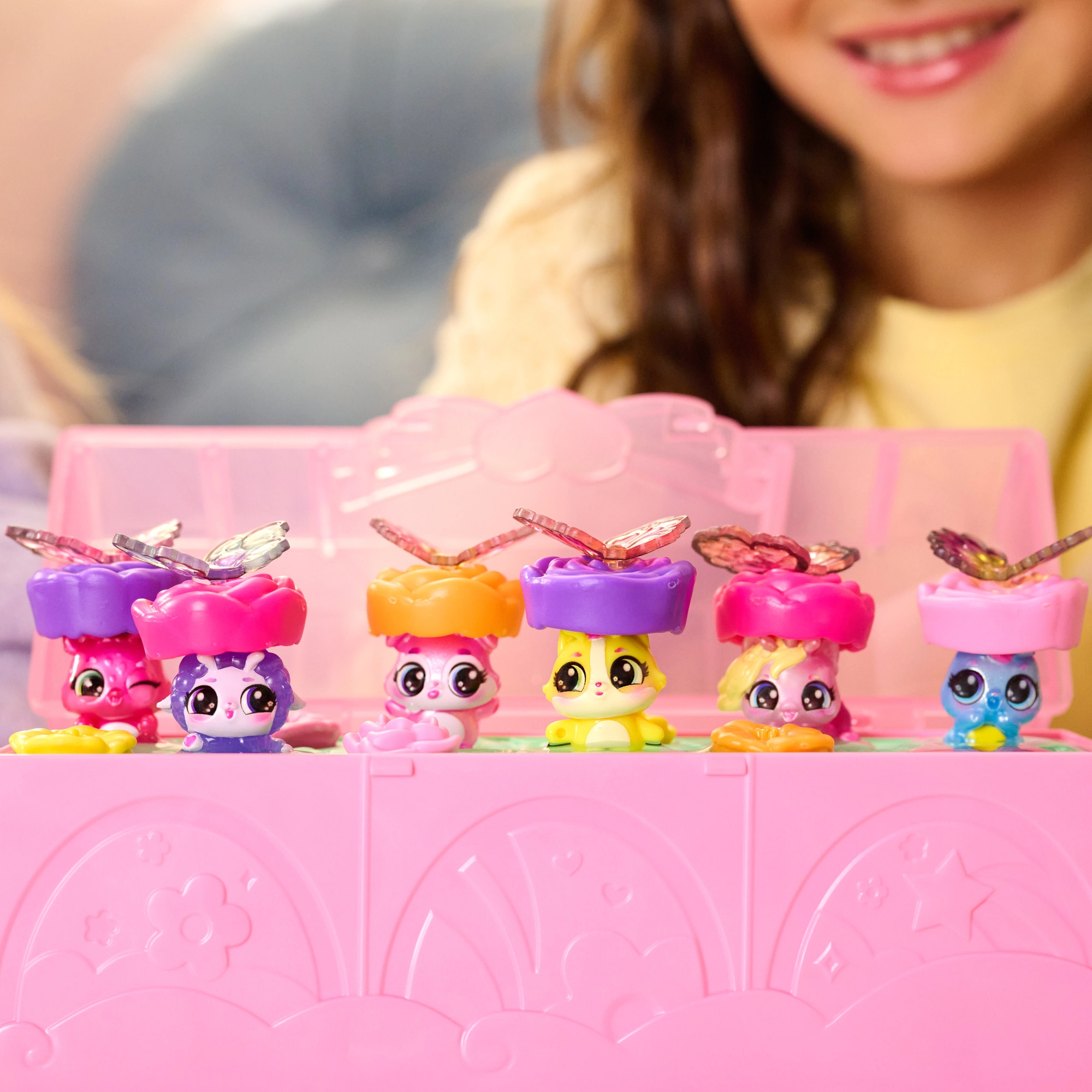 Træd ind i fantasiens verden med samlersættet Hatchimals Bloomables Bloom Bash. Hæld blot vand i hjertet af legekufferten, og knopperne begynder at “vokse” for at afsløre de skjulte figurer – fra en havfrue-enhjørning til en kanin og en hund. Efter afsløringen forvandler du kufferten til et dansegulv, sætter farverige vinger på figurerne og dekorerer låget med Hatchi-Pics.