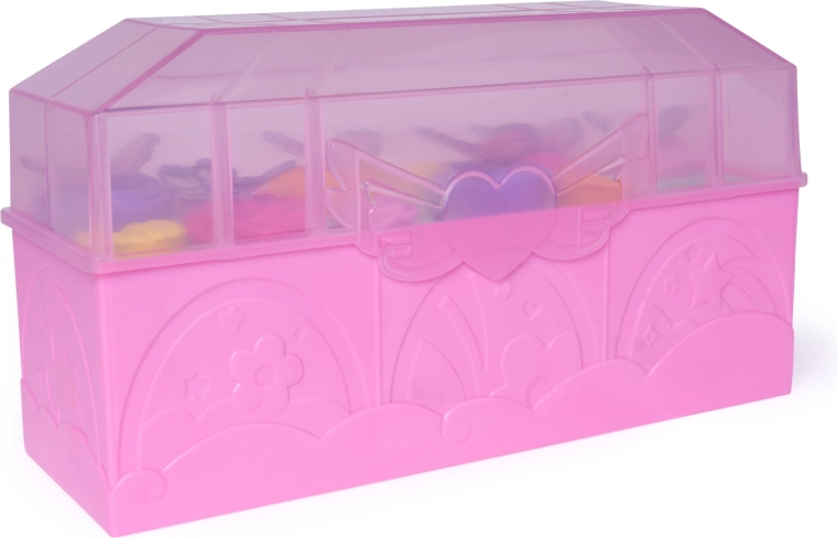 Den lyserøde kuffert med gennemsigtigt låg rummer figurer, knopper og tilbehør. Den fungerer som bærbar opbevaring og en stilfuld udstillingsmontre til samlingen.