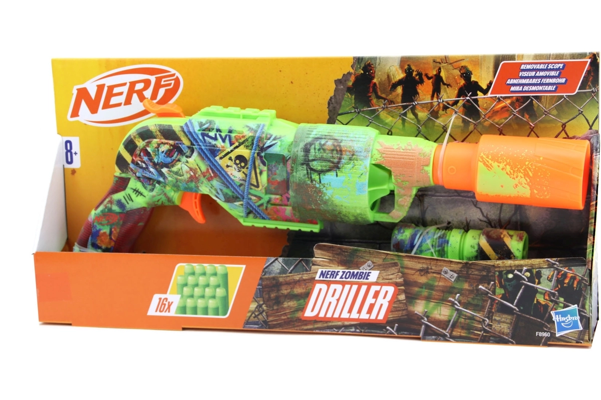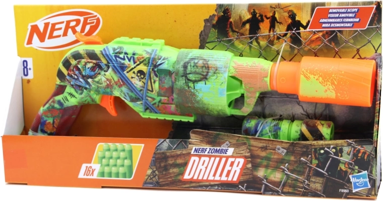 Nerf Zombie Driller-blasteren bringer et unikt look inspireret af zombie-universet – den ligner en ombygget boremaskine klar til kamp. Det fængende print med graffiti-motiver og de sjove detaljer gør den til det perfekte tilbehør til temalege, fester og actionfyldte kampe med venner. Det aftagelige sigte hjælper med at sigte, og de 16 medfølgende pile sikrer masser af sjov.