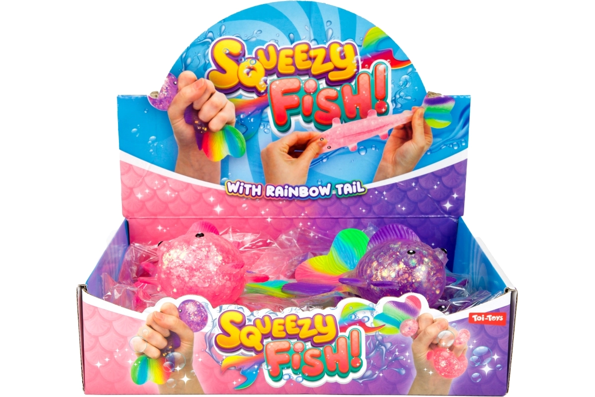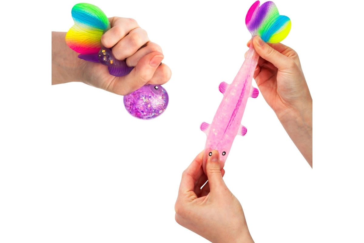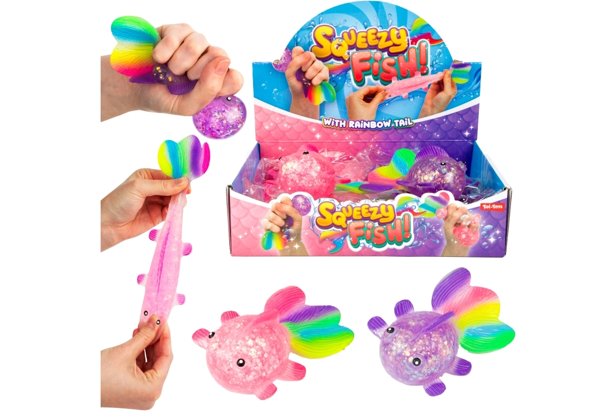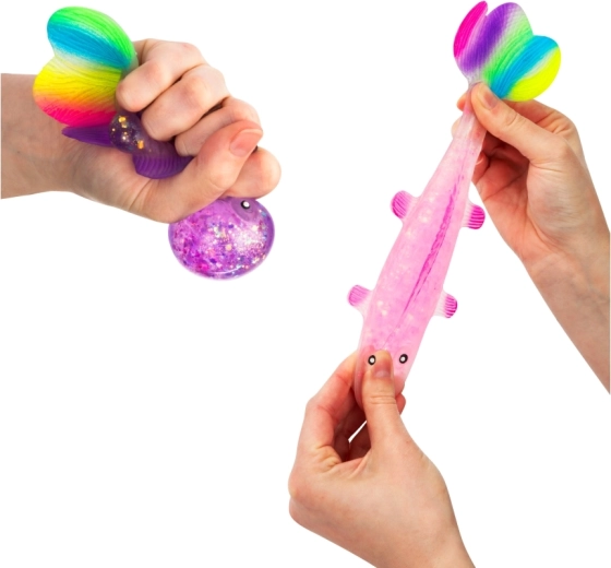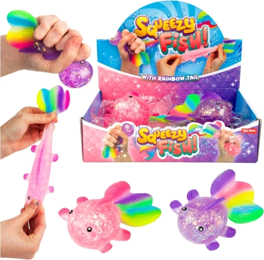 Oplev den beroligende følelse ved at klemme den søde glitrende fisk med blød gelékrop, gennemsigtig effekt med glimmer og farverig hale. Takket være den kompakte størrelse 12×7×4,5 cm ligger den behageligt i hånden og er ideel til rolige stunder derhjemme, i skolen og på kontoret.