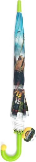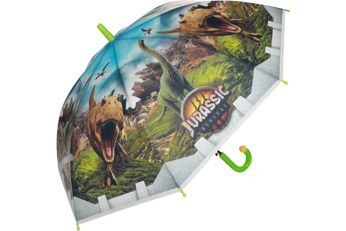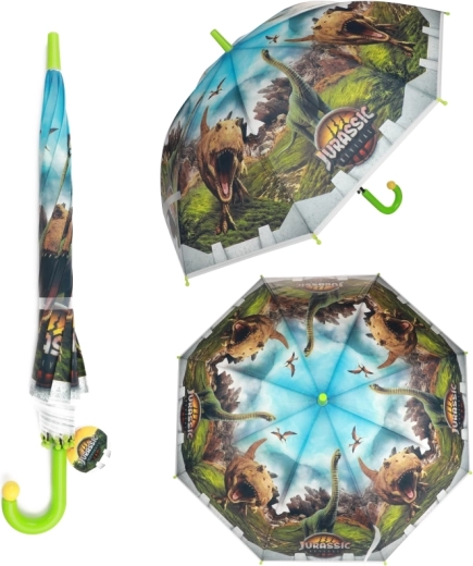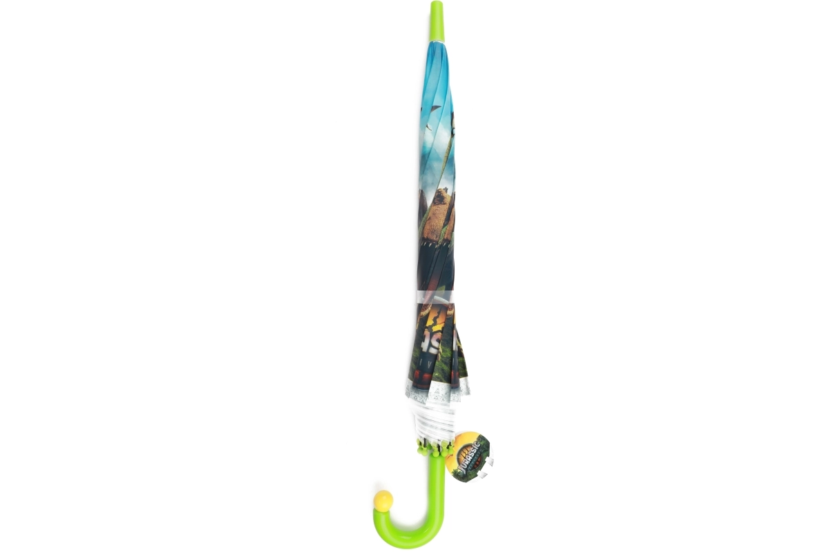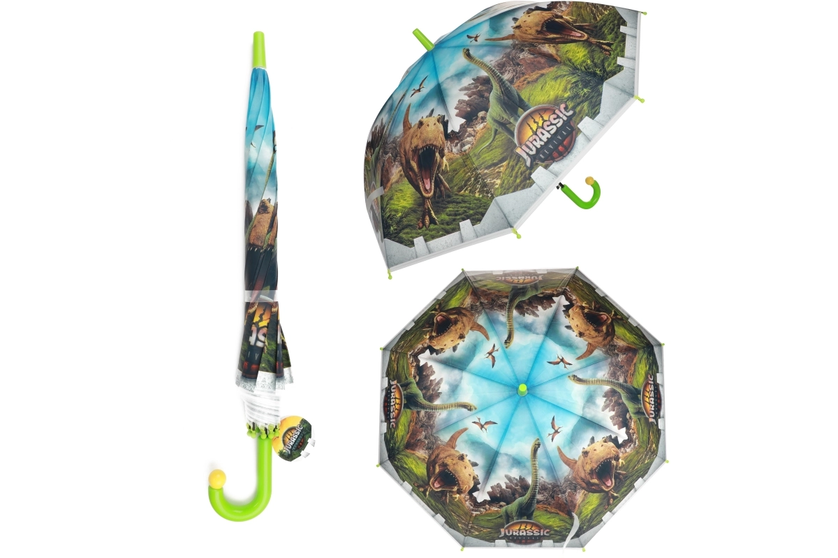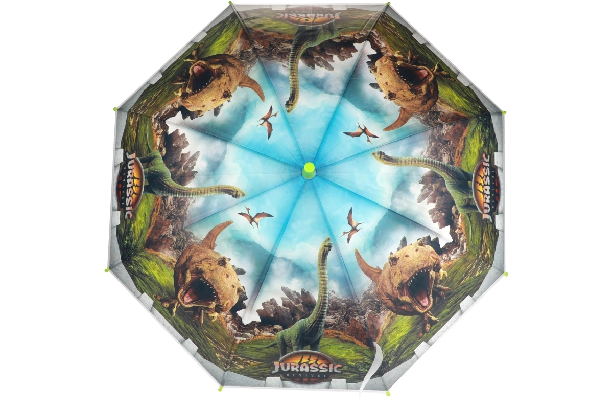 Stilfuld børneparaply med motiv af Jurassic World og dinosaurer, som beskytter små eventyrere mod regnen. Den har manuel udløseråbning, stærk konstruktion med metalribber og sikre afrundede spidser. Takket være 80 cm bredde og et ergonomisk buet håndtag ligger den godt i hånden og dækker pålideligt mod dårligt vejr.