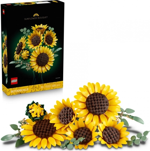 Nyd den afslappende byggeproces med seks solsikker i forskellige stadier af blomstring og fire eukalyptusstilke – det ideelle projekt til en rolig aften.