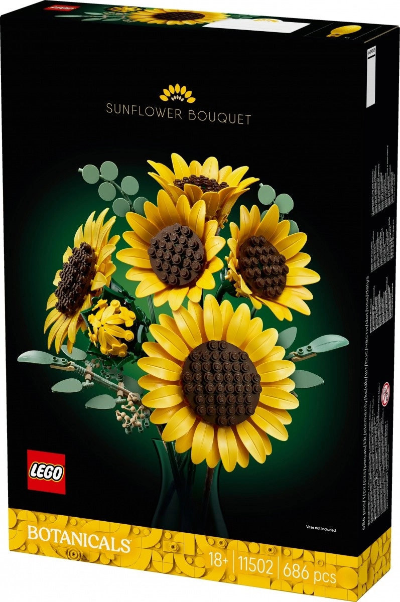 Skab en solrig stemning derhjemme med solsikkebuketten fra LEGO Botanicals-kollektionen. Du bygger en knop, tre, der er ved at springe ud, og to fuldt udsprungne blomster, som suppleres af fire eukalyptusstilke. Takket være gennemtænkte byggeelementer har blomsterne naturtro kronblade og teksturerede centre, mens stilke og blade nemt kan positioneres for en perfekt komposition i vasen.