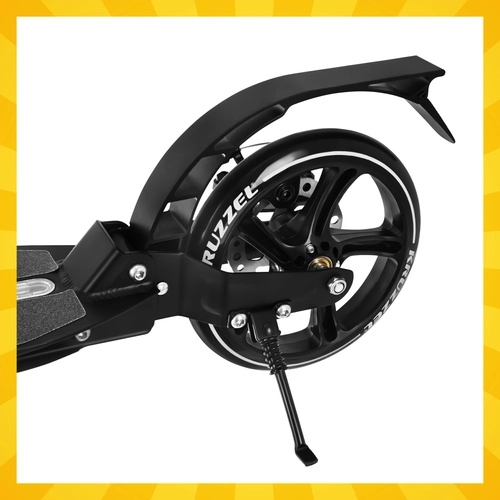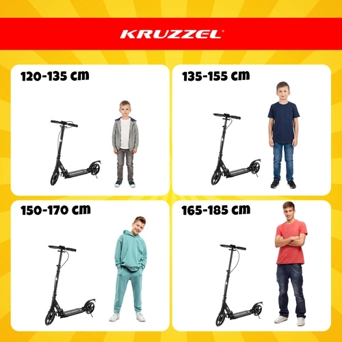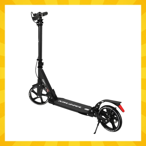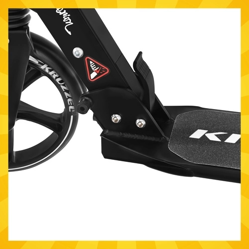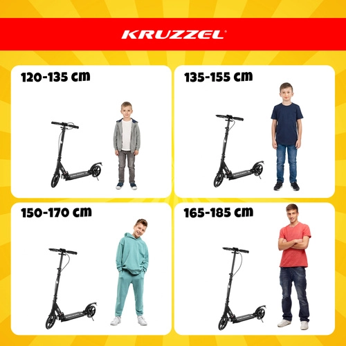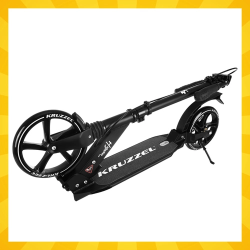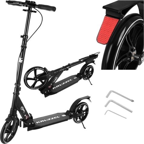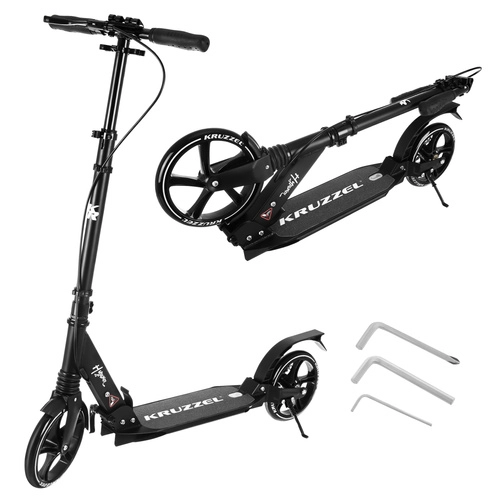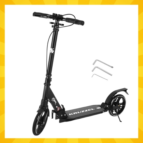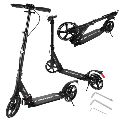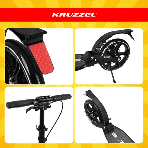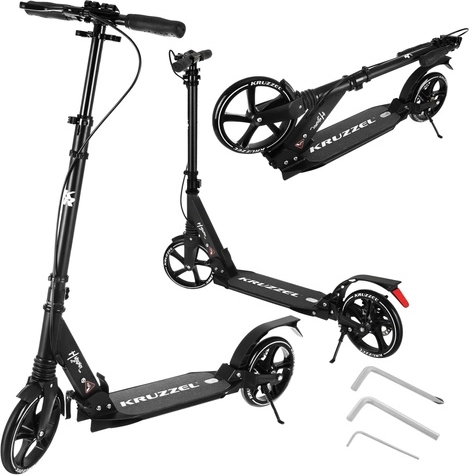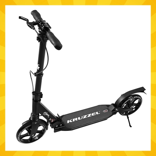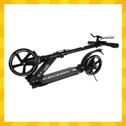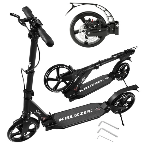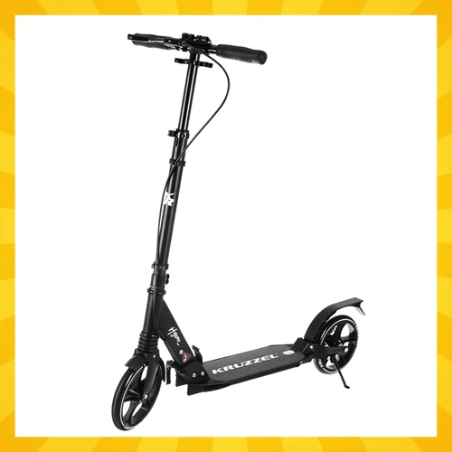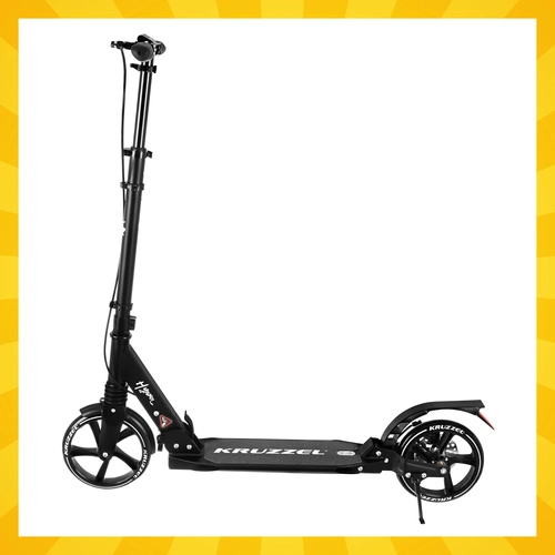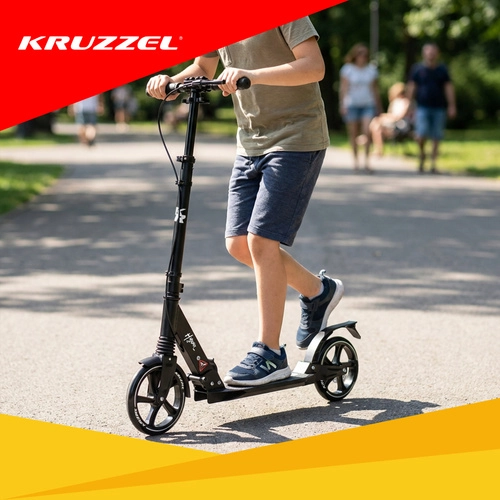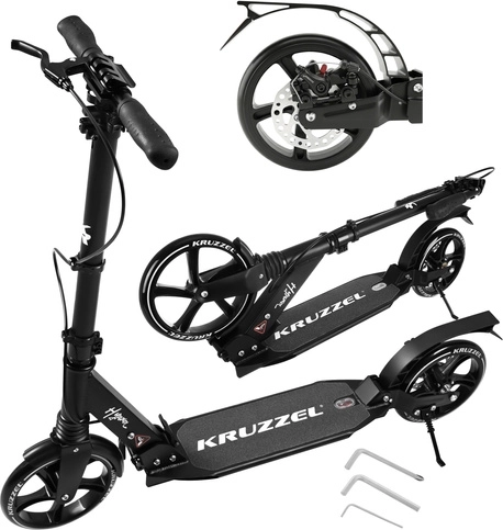Let og holdbart løbehjul KRUZZEL Hyperion til by og cykelstier kombinerer store 200 mm gummihjul, glatte ABEC-9-lejer og et dobbelt bremsesystem (håndbetjent skive + fodbremse). Takket være hurtig sammenklapning, højdejusterbart styr i 4 trin og affjedring tilbyder den komfort, sikkerhed og mobilitet for børn fra 10 år og voksne.