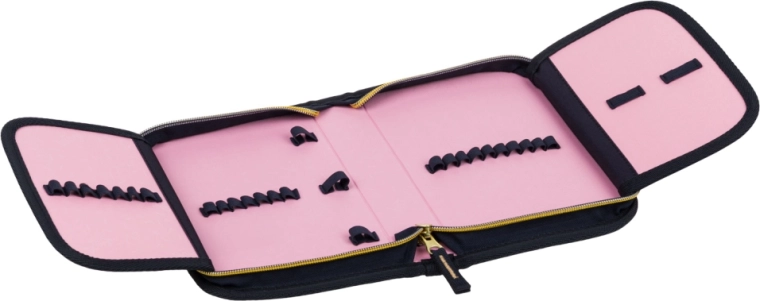 Sættet suppleres af et klassisk etagers penalhus med to flapper, slidstærk YKK-lynlås, lille lomme til småting, vindue til skema og stærke elastikker også til trekantede farveblyanter. Penalhuset leveres uden indhold og er fremstillet af genbrugsmaterialer. Den robuste pose til sko eller sport har aftørringsvenlig overflade, snorelukning og karabinhage, så den nemt kan fastgøres til skoletasken eller bæres på ryggen.