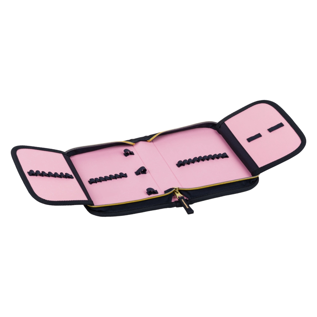 Takket være muligheden for fuld udklapning får du perfekt adgang til alle rum og elastikker, som er egnet også til trekantede farveblyanter og tuscher. Penalhuset leveres uden indhold, så du kan udstyre det præcis efter dine behov.