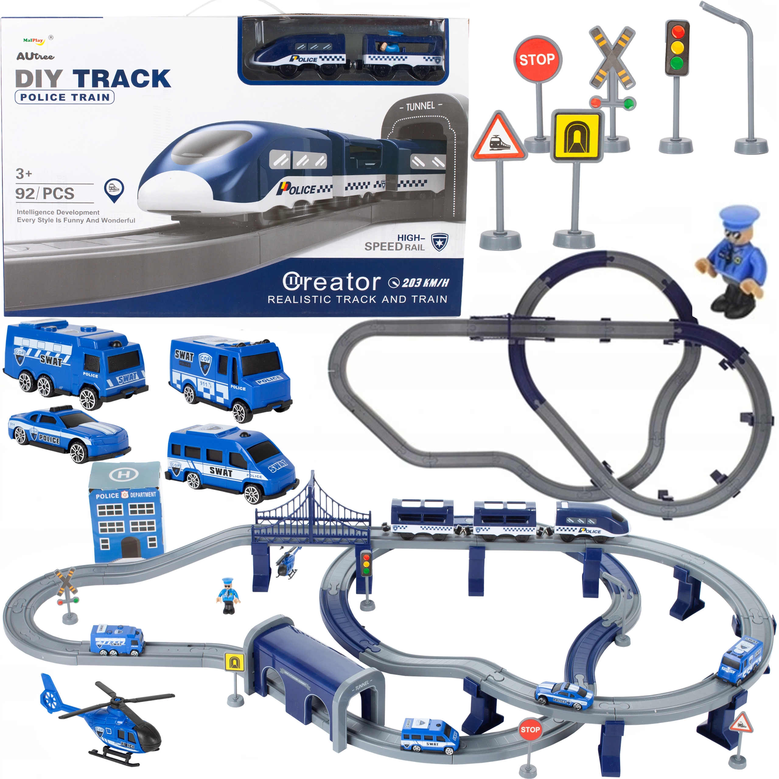 Sættet rummer rigt tilbehør: to vogne, fire forskellige politibiler, en politibetjent-figur, kommissariat, tunnel, bro, skinner og understøtninger. Skinnebredde er cirka 4 cm, hvilket sikrer stabil kørsel og nem samling af banen.