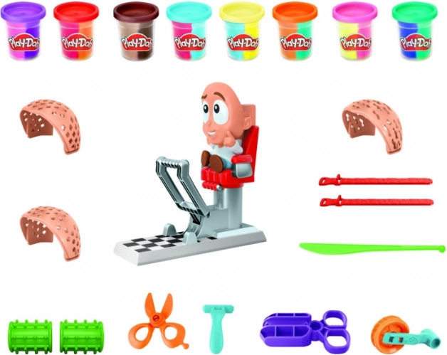 - Figur med stol, pressebase, saks, kam, forme, bøtter med Play-Doh modellervoks (flere farver)