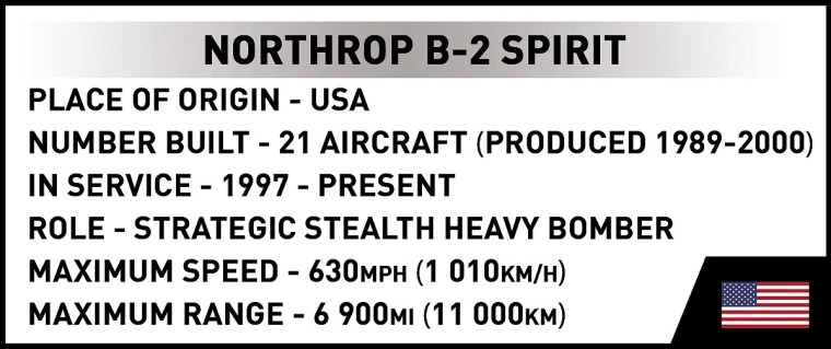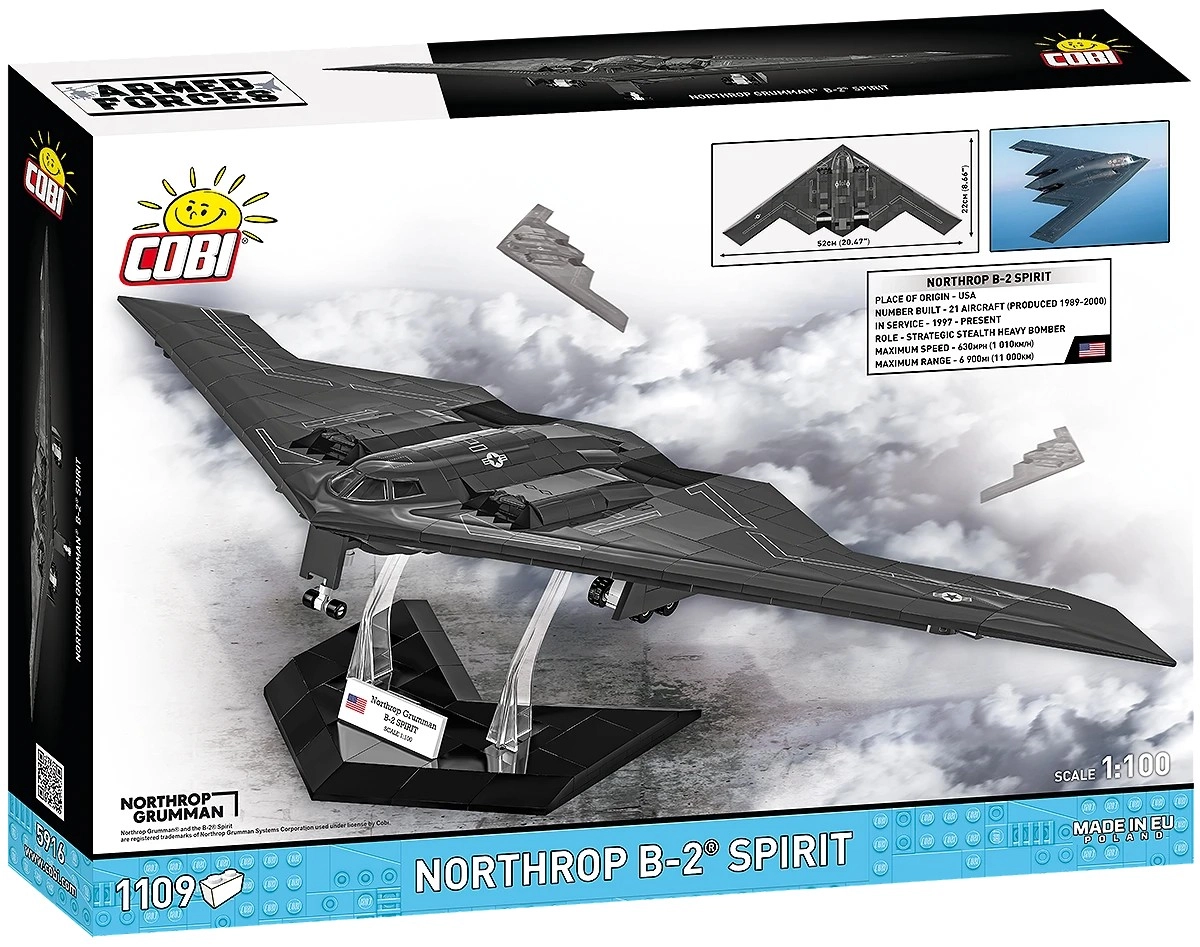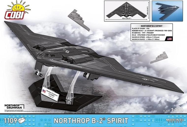 Skab din egen luftfartslegende: NORTHROP B-2 SPIRIT fra COBI er et præcist byggesæt med fremragende konstruktionsnøjagtighed, der trofast gengiver den karakteristiske “flyvende vinge” og flade stealth-overflader. Takket være skala 1:100 og specialdesignede klodser får du en markant udstillingsmodel med imponerende detaljer.