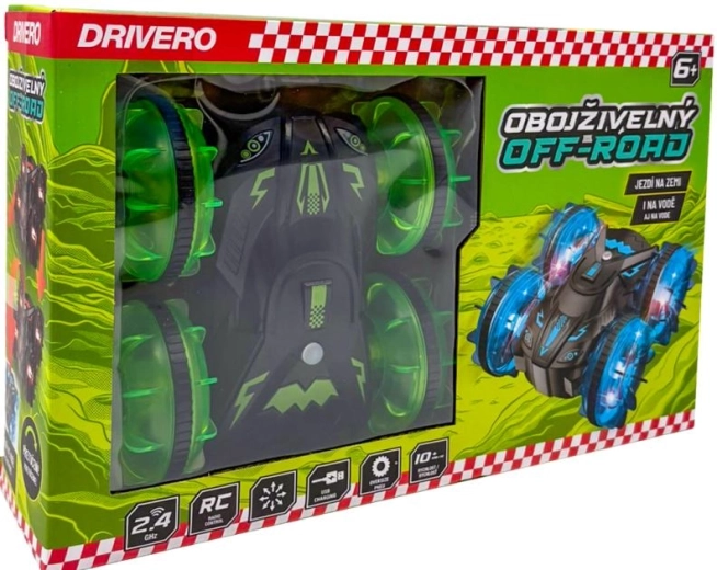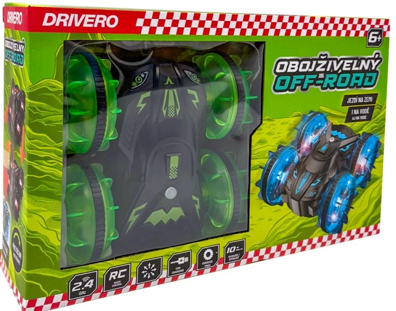 Den amfibiske RC offroad Drivero kombinerer holdbarhed, fart og bevægelsesfrihed på forskellige underlag. Takket være den tætnede konstruktion klarer den kørsel både på land og i vand, mens de gennemsigtige hjul med LED-dioder skaber en imponerende lyseffekt. Styring på frekvensen 2,4 GHz sikrer stabil rækkevidde og problemfri kørsel uden gensidig interferens.