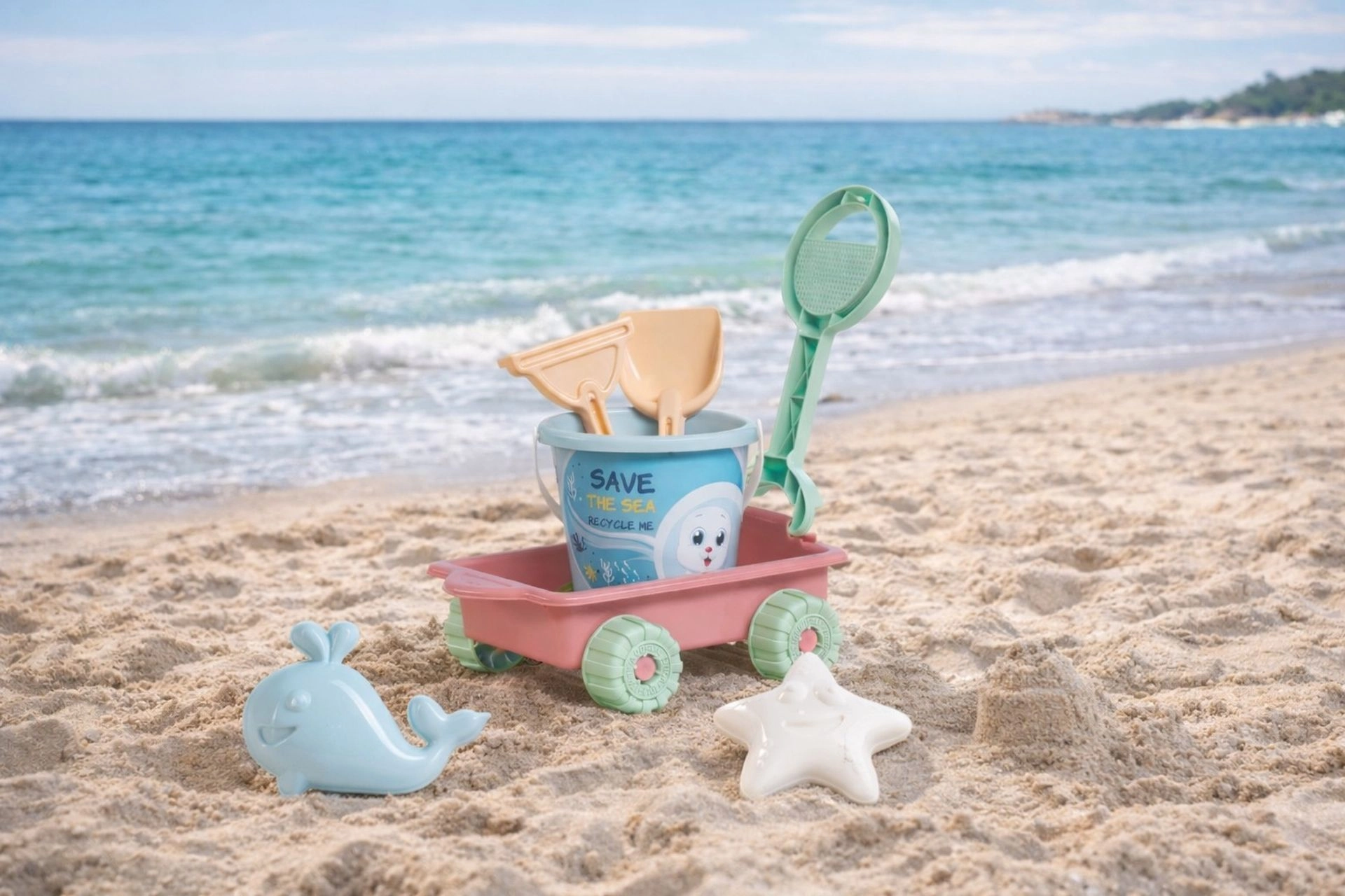 Spand, skovl, rive og to forme (fisk og søstjerne) stimulerer fantasi og finmotorik. Alt matcher i smukke pastelfarver.