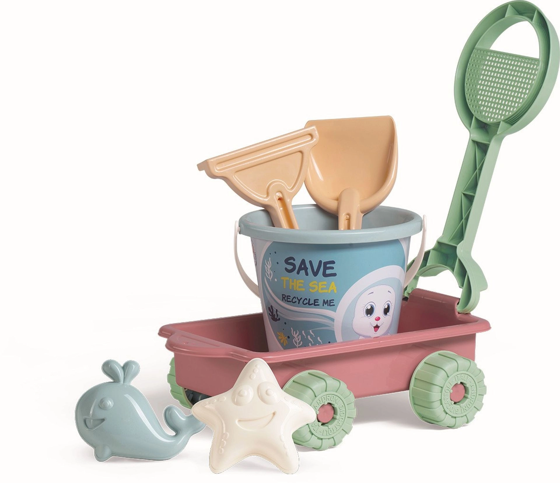 - Vogn med håndtag og si, spand, skovl, rive, form fisk, form søstjerne