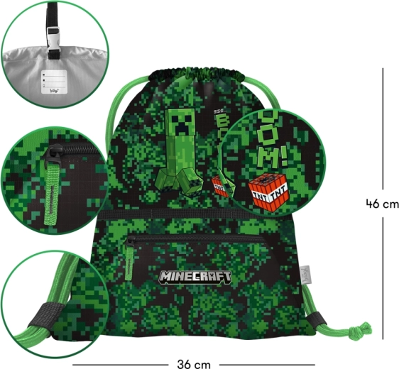 Stilfuld BAAGL-pose i det populære MINECRAFT BOOM-motiv er et godt valg for skolebørn og spilfans. Velegnet til indesko, idræt, fritidsaktiviteter og korte ture. Det robuste materiale er let at vedligeholde, og de stærke snore sikrer komfortabel bæring på ryggen eller over skulderen.