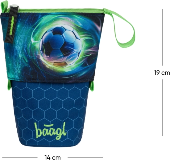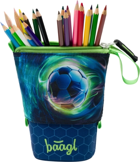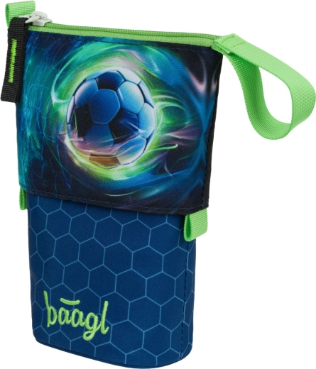 Stilfuldt skolepenal Pastelkovník fra Baagl med motiv af en fodbold, fremstillet af robust og vandafvisende materiale, som holder formen godt og beskytter indholdet pålideligt. Takket være det smarte et-trins stativdesign og den overskuelige organisering af skriveredskaber er det ideelt til skolebørn. Produktet er bæredygtigt og indeholder mindst 50 % genanvendte materialer med GRS-certificering.