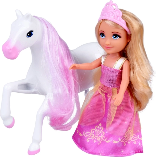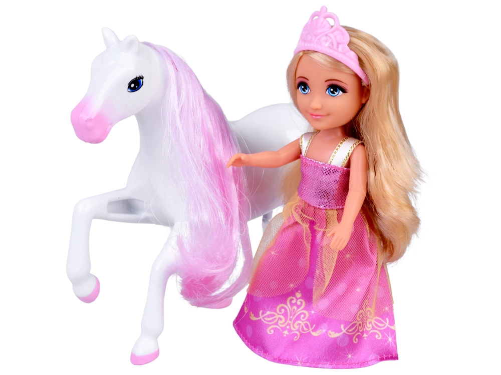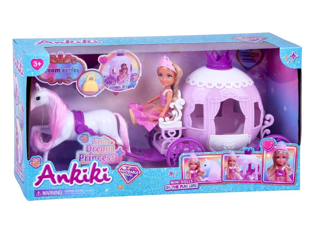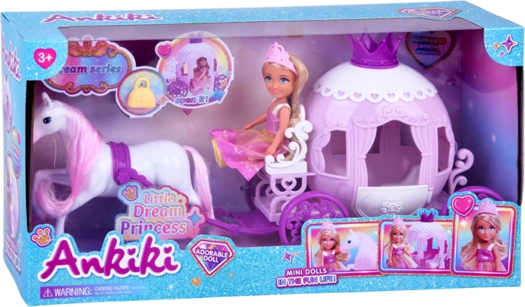Dette charmerende sæt rummer alt til en magisk tur ind i fantasiens rige: en lille prinsesse i lyserød kjole med krone, en pyntet karet med krone og hjerte-detaljer og en hvid hest med lyserød man og hale. Takket være de kompakte mål kan børn nemt tage det med overalt.