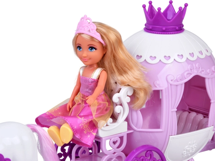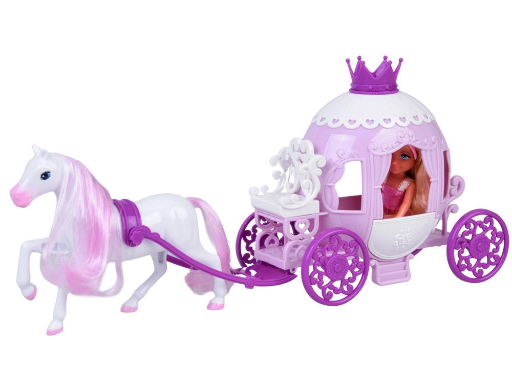 Den pyntede lyserød-hvide karet med krone og dekorative hjul bringer ægte eventyrstemning ind i legen. Hjulene drejer frit, og kareten kan trækkes af hesten.