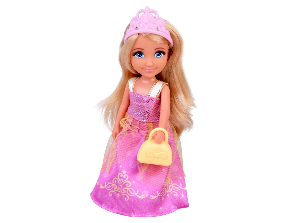 Dukke med langt blond hår, lyserød krone og glitrende kjole. Ideel til rolleleg – fra kongelige besøg til baller på slottet.