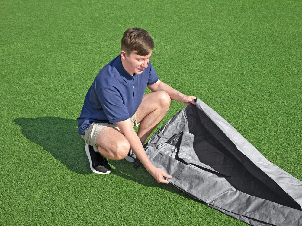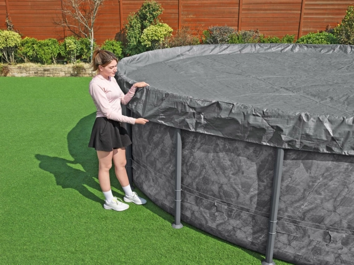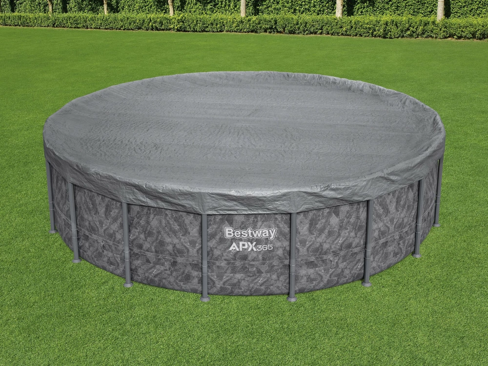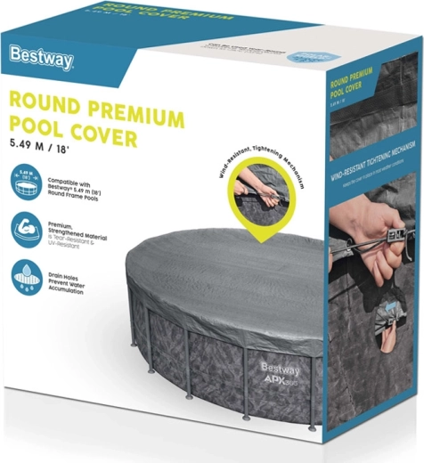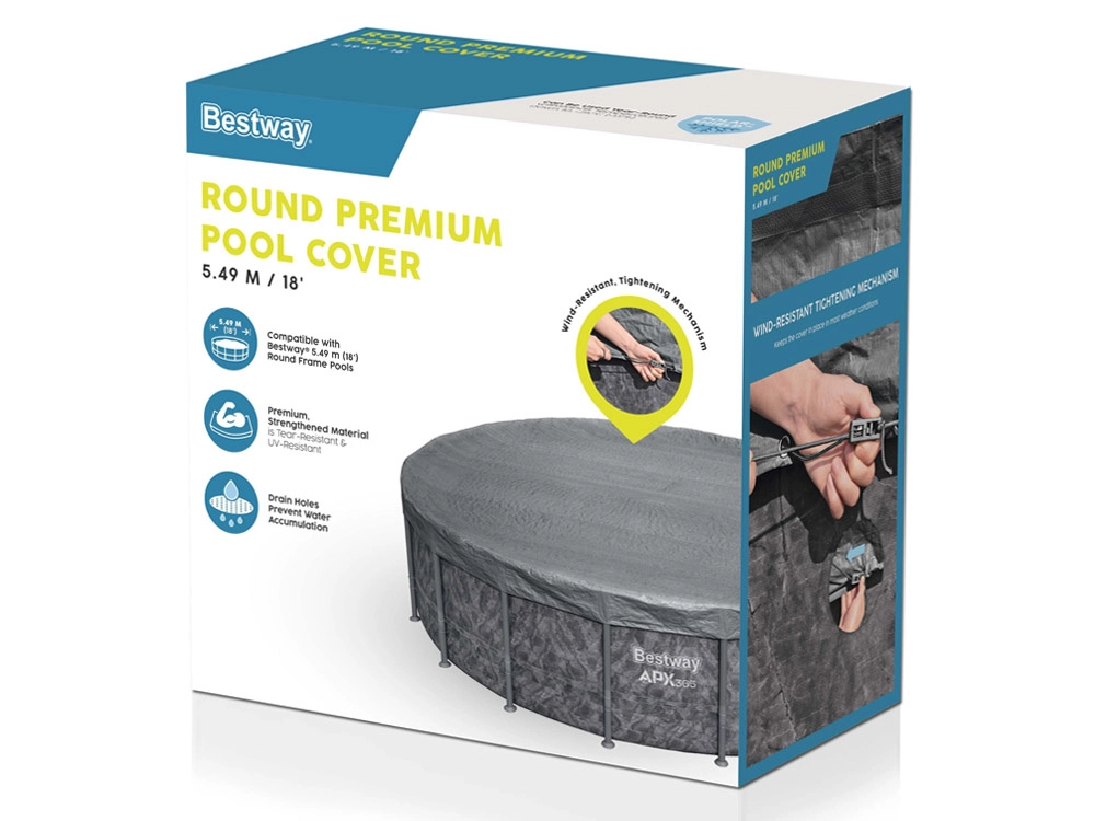 Den kvalitetsrige BESTWAY-afdækningspresenning til runde pools med en diameter på 5,49 m er designet til brug gennem hele sæsonen. Det forstærkede materiale med UV-beskyttelse modstår rivning og vejrpåvirkning, mens Polar‑Shield-overfladebehandlingen hjælper med at bevare egenskaberne selv ved lave temperaturer.