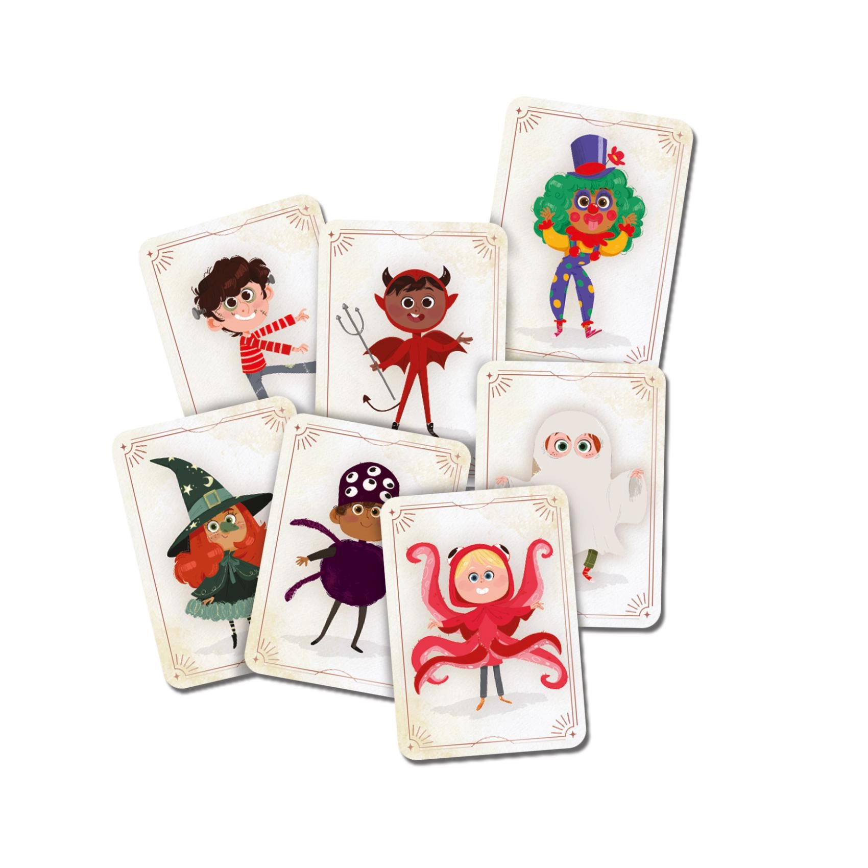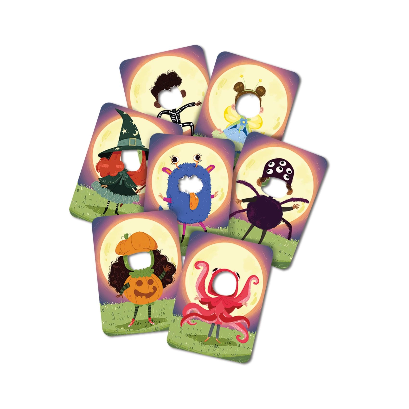 - Visuelt attraktive kort – kostumer som heks, skelet, monstre og andre figurer begejstrer børn.