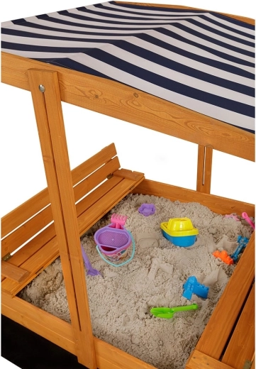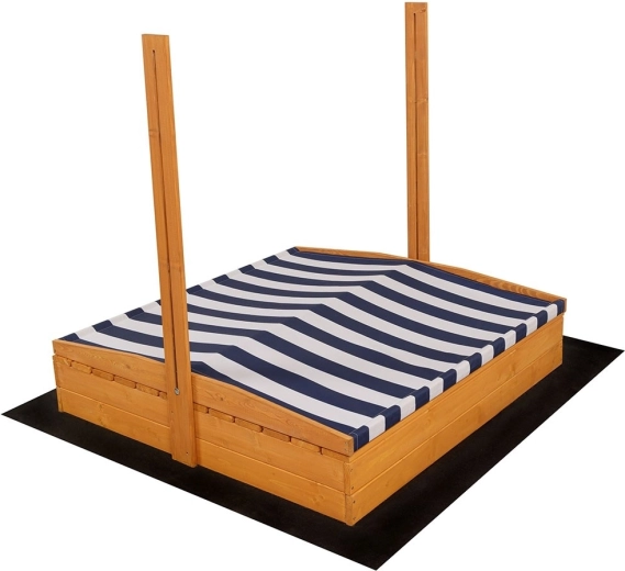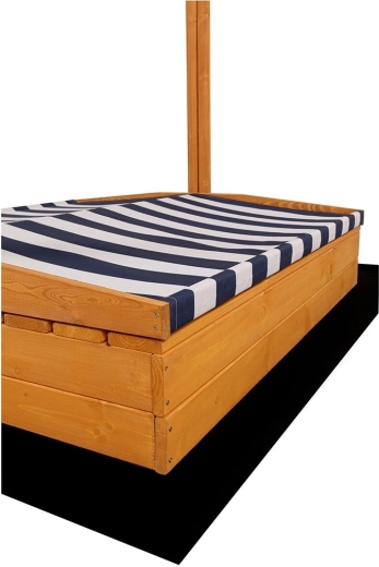 Den blå‑hvidt stribede overdækning kan justeres i både højde og hældning, beskytter børn mod solen og dækker efter legen hele sandkassens overflade mod regn og snavs.