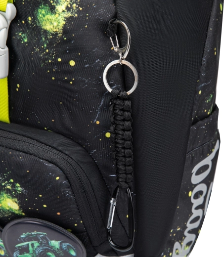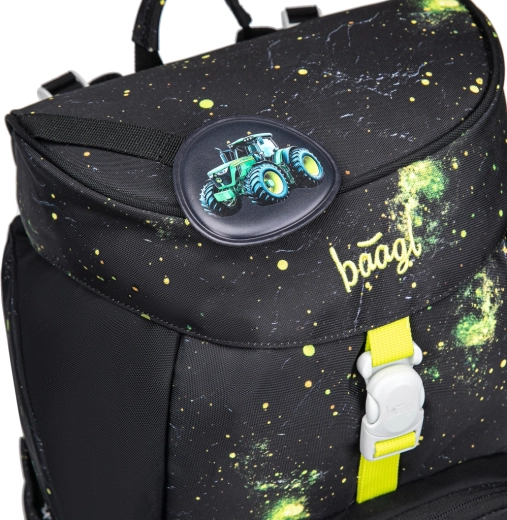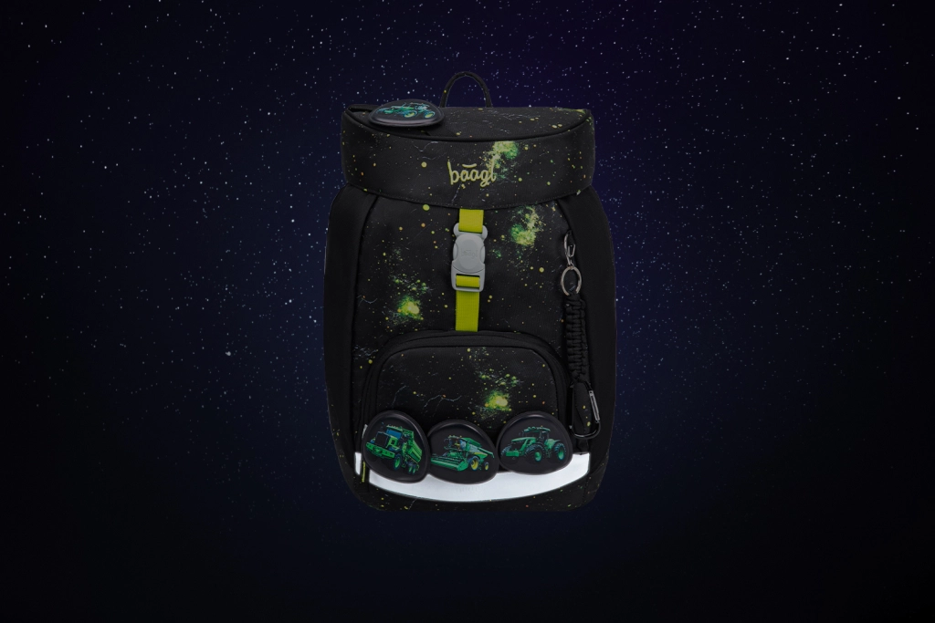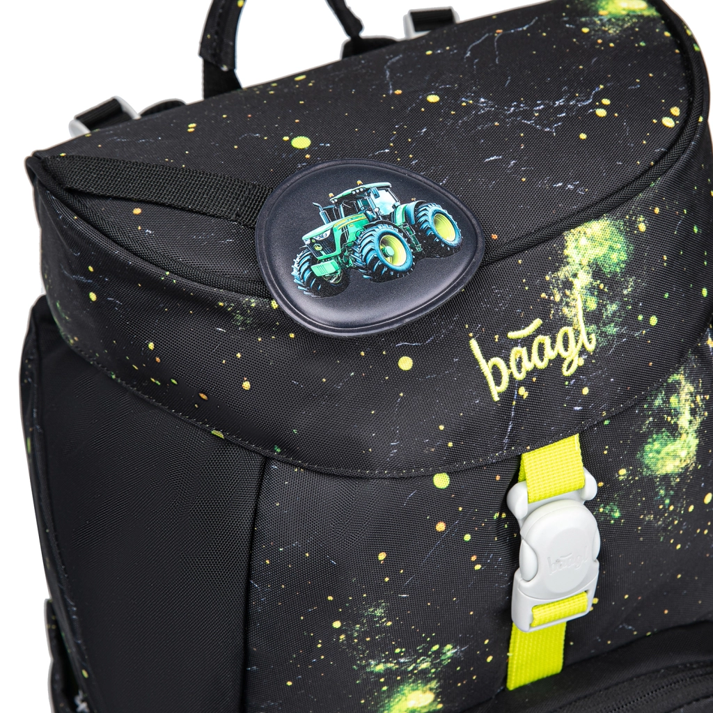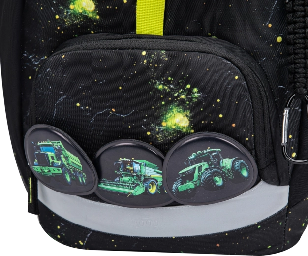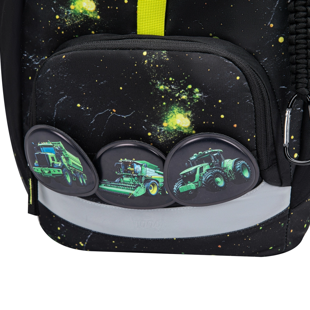 Den praktiske enkeltkammer-indretning med indvendig lomme og elastik til mapper gør det nemt at organisere skoleudstyr. Rygsækken er fremstillet af genanvendte, vandafvisende materialer og er udstyret med tydelige reflekselementer for øget synlighed og sikkerhed. Det intuitive lukningssystem Magnetic Click kan selv en førsteklasser betjene. Designet kan let varieres takket være aftagelige badges (patches) med traktormotiv.