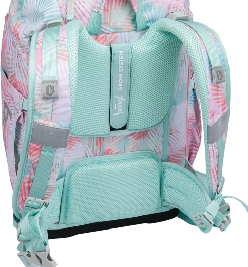 Rygsystemet Grow kan indstilles i tre størrelser for optimal rygstøtte. Åndbar polstring, aluminiumsforstærkning, brystrem og aftageligt hoftebælte sikrer stabilitet og en sund kropsholdning.