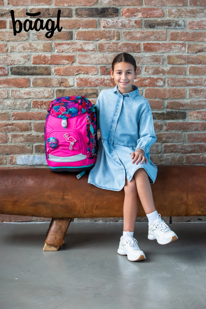 Stilfuldt skolesæt med flamingo-motiv omfatter den ergonomiske rygsæk BAAGL AIRY PLUS, et-etagers penalhus, pose til skiftesko, forklæde og en lille pung. Rygsækken har en justerbar rygstøtte, der vokser med barnet, vægt under 1,2 kg, vandafvisende genanvendt materiale og reflekterende elementer. Penalhus med kvalitetslynlås fra YKK og gennemtænkt organisering, pose med karabinhage til fastgørelse, praktisk forklæde til kreativt arbejde og pung til halsen udgør det perfekte udstyr til skolebarnet.
