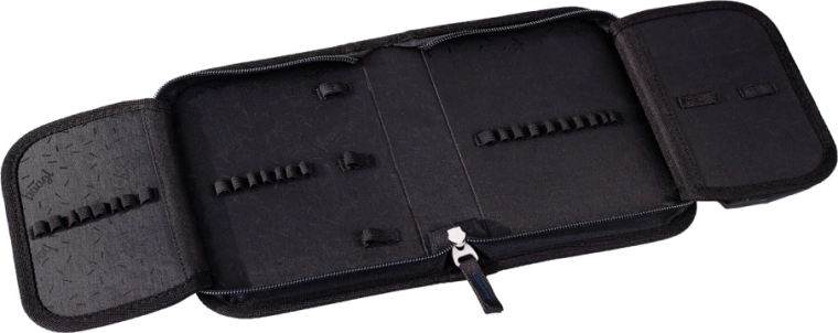Udfoldeligt penalhus med to flapper, solid elastikholder til farver og YKK-lynlås. Pung med nakkestrop opbevarer sikkert kontanter og kort.