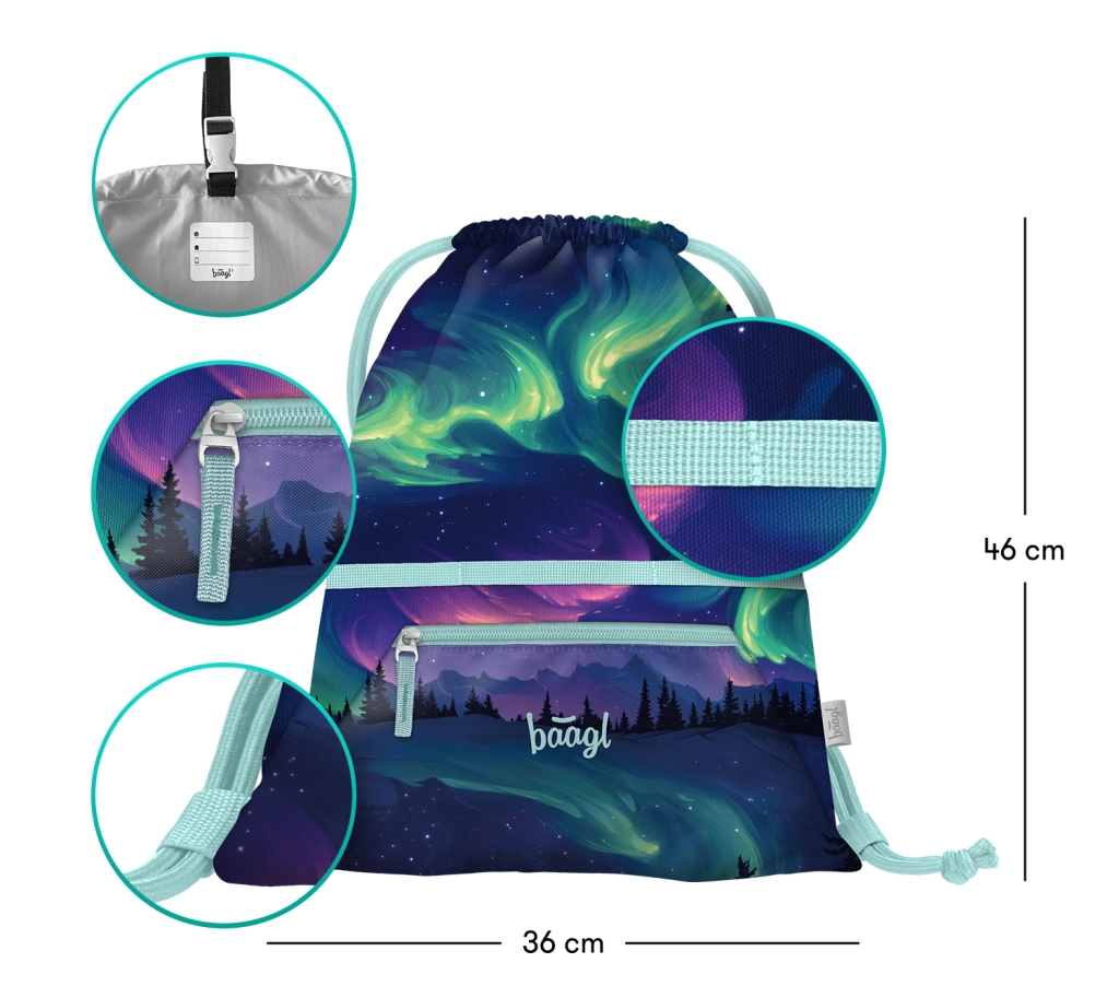 Posen med lomme Baagl Aurora GRS er en stilfuld og funktionel løsning til daglig opbevaring af indesko, sportstøj og småting til skole eller rejse. Den forreste lynlåslomme holder nøgler, penge eller telefon sikkert ved hånden, mens det robuste, aftørringsvenlige materiale sikrer lang holdbarhed og nem vedligeholdelse.