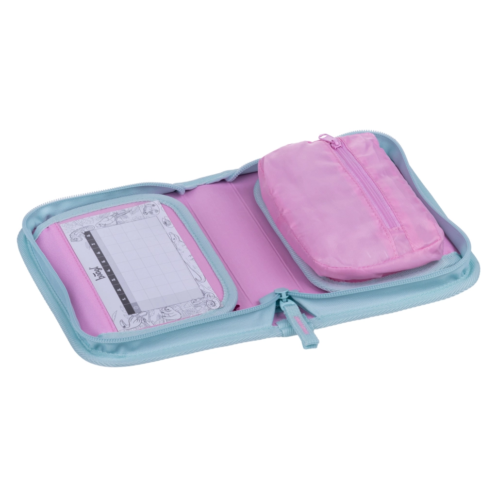 Den indvendige inddeling omfatter faste elastikstropper til blyanter, farveblyanter og tuscher, lomme til småting, netlomme med lynlås samt vindue til skema for hurtig orientering. Skrinet kan foldes helt ud efter åbning, så du har alt lige for øjnene. Materialet med Global Recycled Standard (GRS) bekræfter hensyn til naturen og høje kvalitetsstandarder.