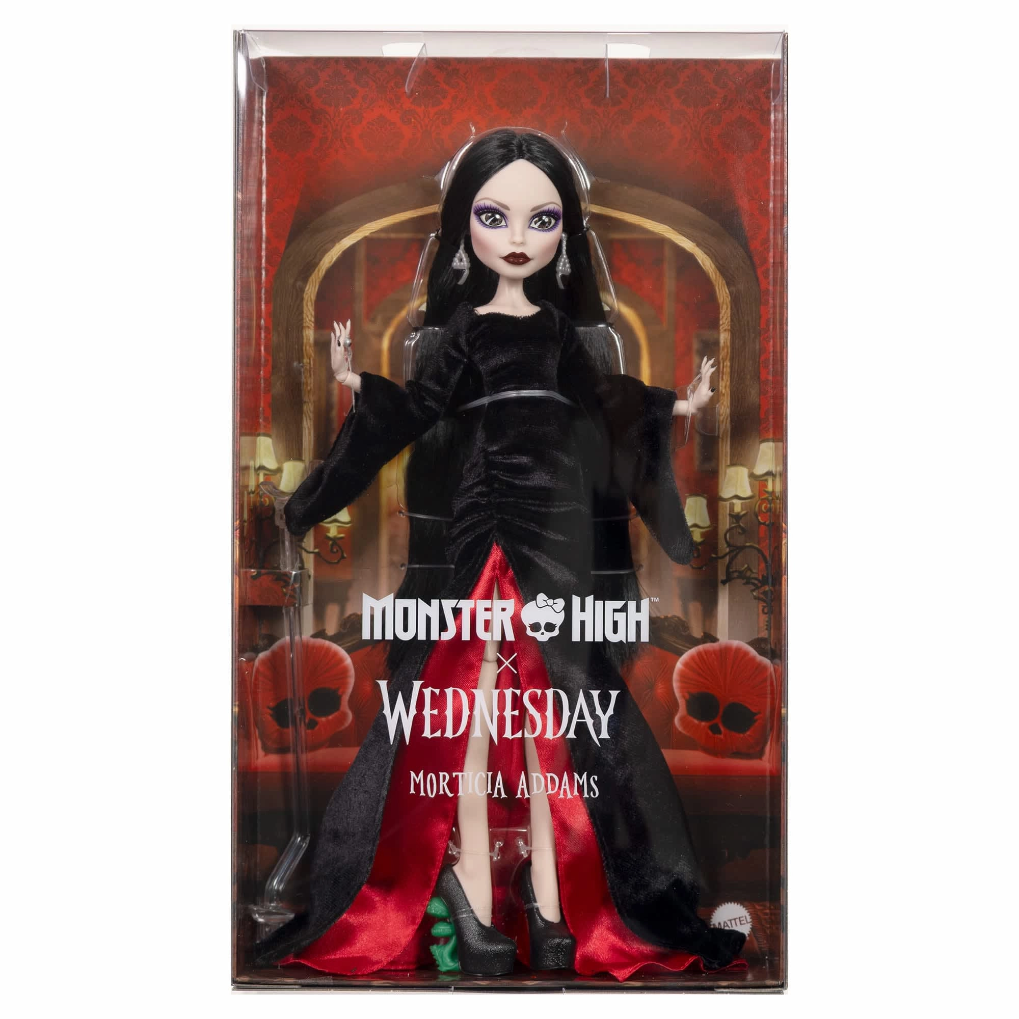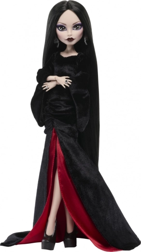 Oplev den mørke elegance fra den ikoniske figur MORTICIA ADDAMS i Monster High Collector-kollektionen. Dukken imponerer med en lang sort kjole med dramatiske, vide ærmer, fløjlsagtig tekstur og røde accenter i slidsen. Realistisk indlede (rooted) hår, bleg hud og markant makeup understreger det autentiske look kendt fra serien WEDNESDAY.