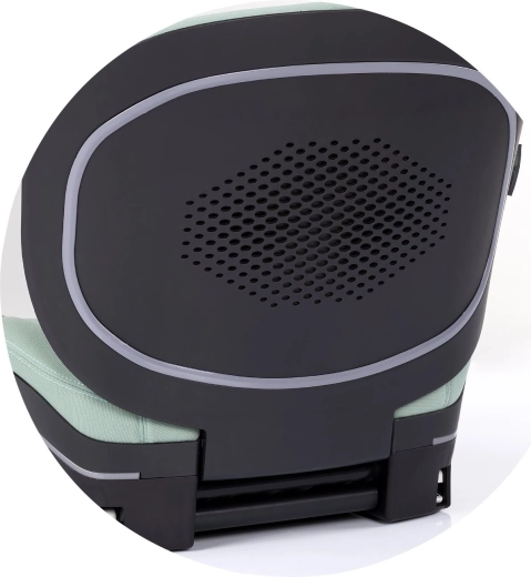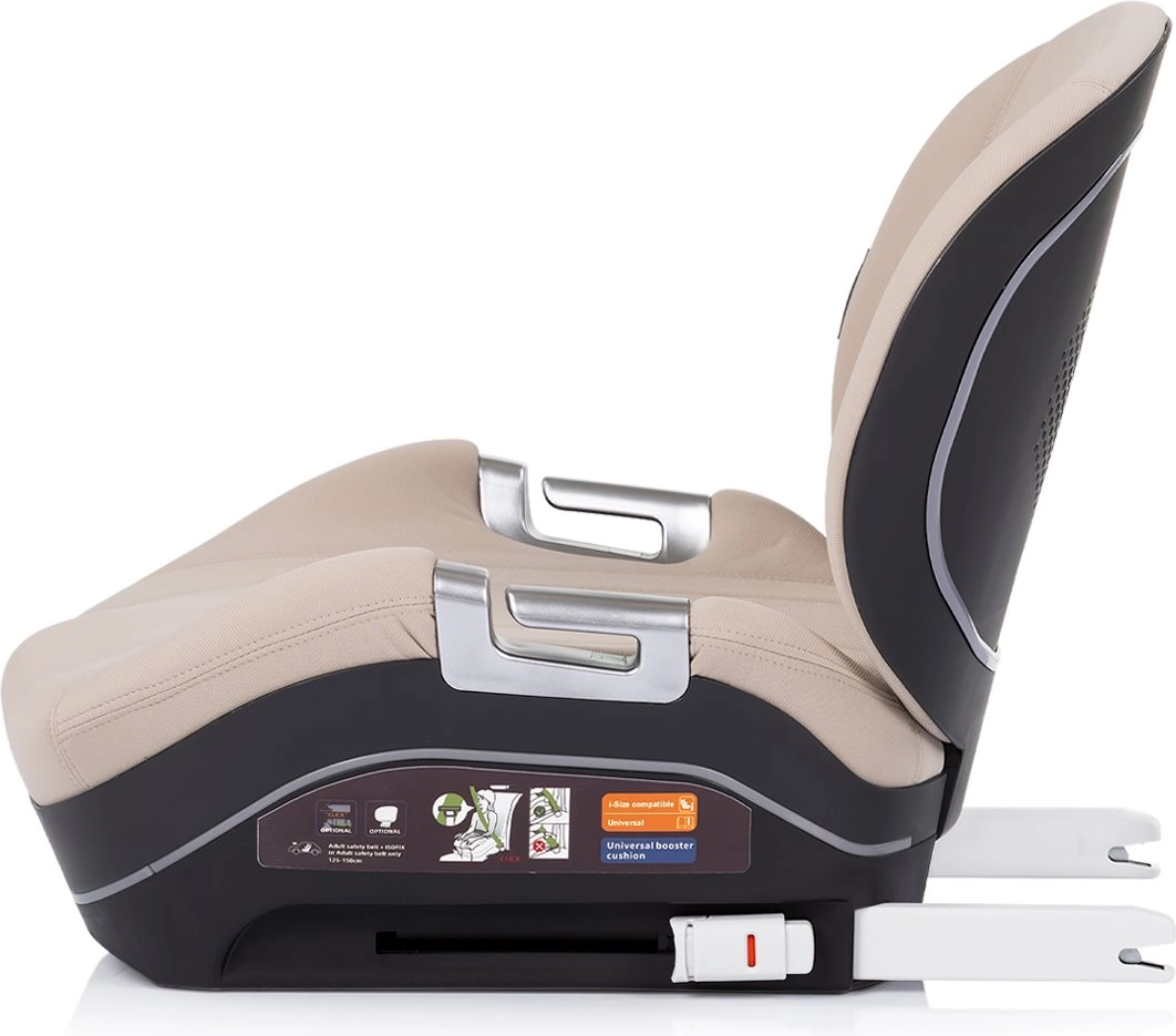 Det ergonomisk formede sæde med blød polstring, armlæn og en åndbar, aftagelig rygstøtte giver komfort selv på længere ture. Grønne sikkerhedsindikatorer bekræfter visuelt korrekt klik af ISOFIX-connectors – klik og kør. Det elegante Latte-betræk med luksuriøse metalaccenter er let at rengøre og understreger bilens moderne interiør.