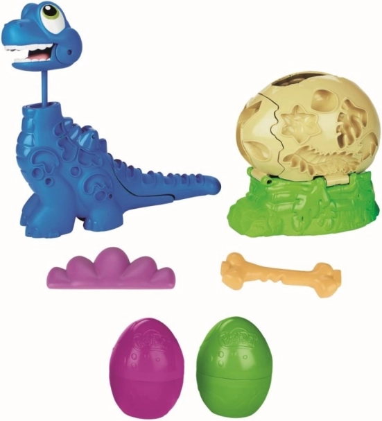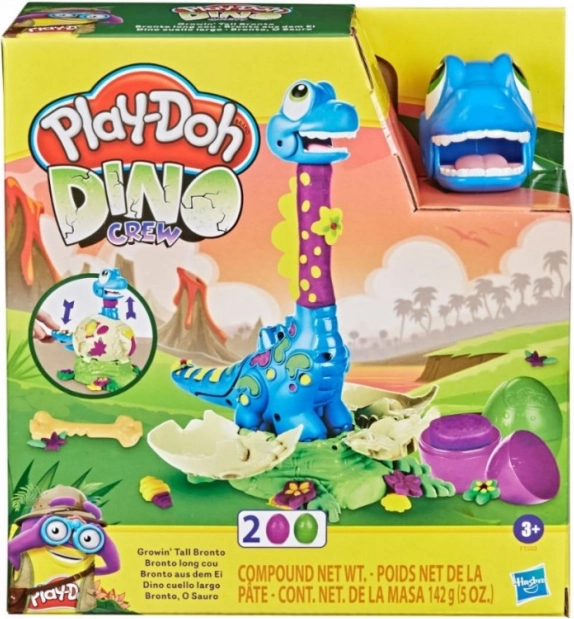 Hjælp den lille Bronto ud af ægget, og se halsen vokse! Fyld PLAY-DOH-figuren og tryk på halen – halsen skydes op, og legen kan begynde. Med formene på figuren og ægget kan du lave blade, blomster, knogler og en stilfuld sløjfe.
