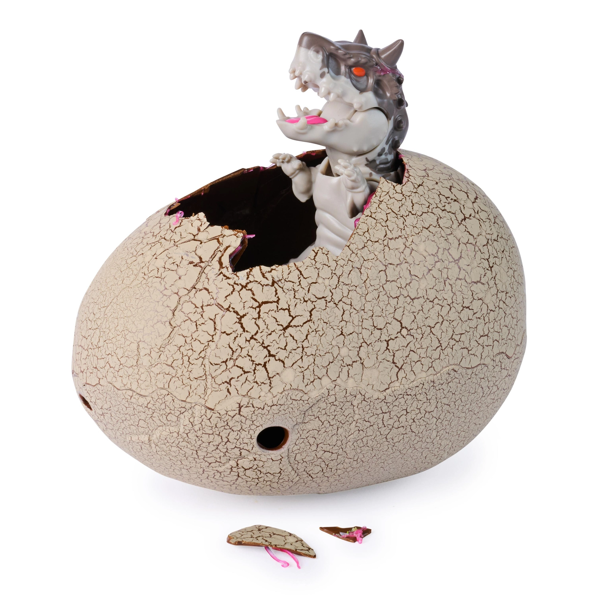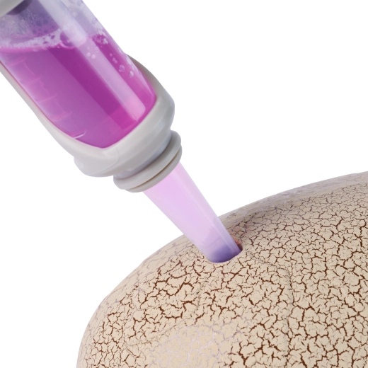 Når væsken er sprøjtet ind, dukker revner op på æggets overflade, og en lille hybrid-dinosaur klækkes – et øjeblik, der begejstrer enhver lille opdagelsesrejsende.