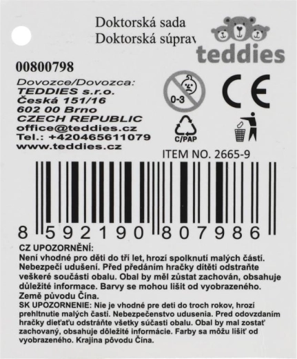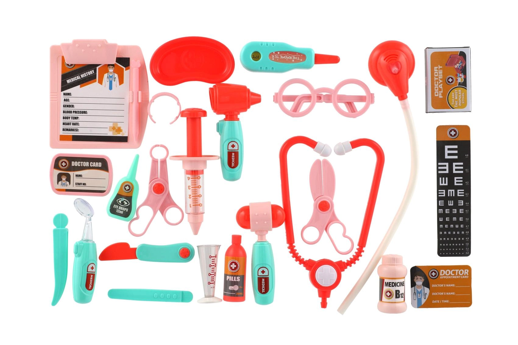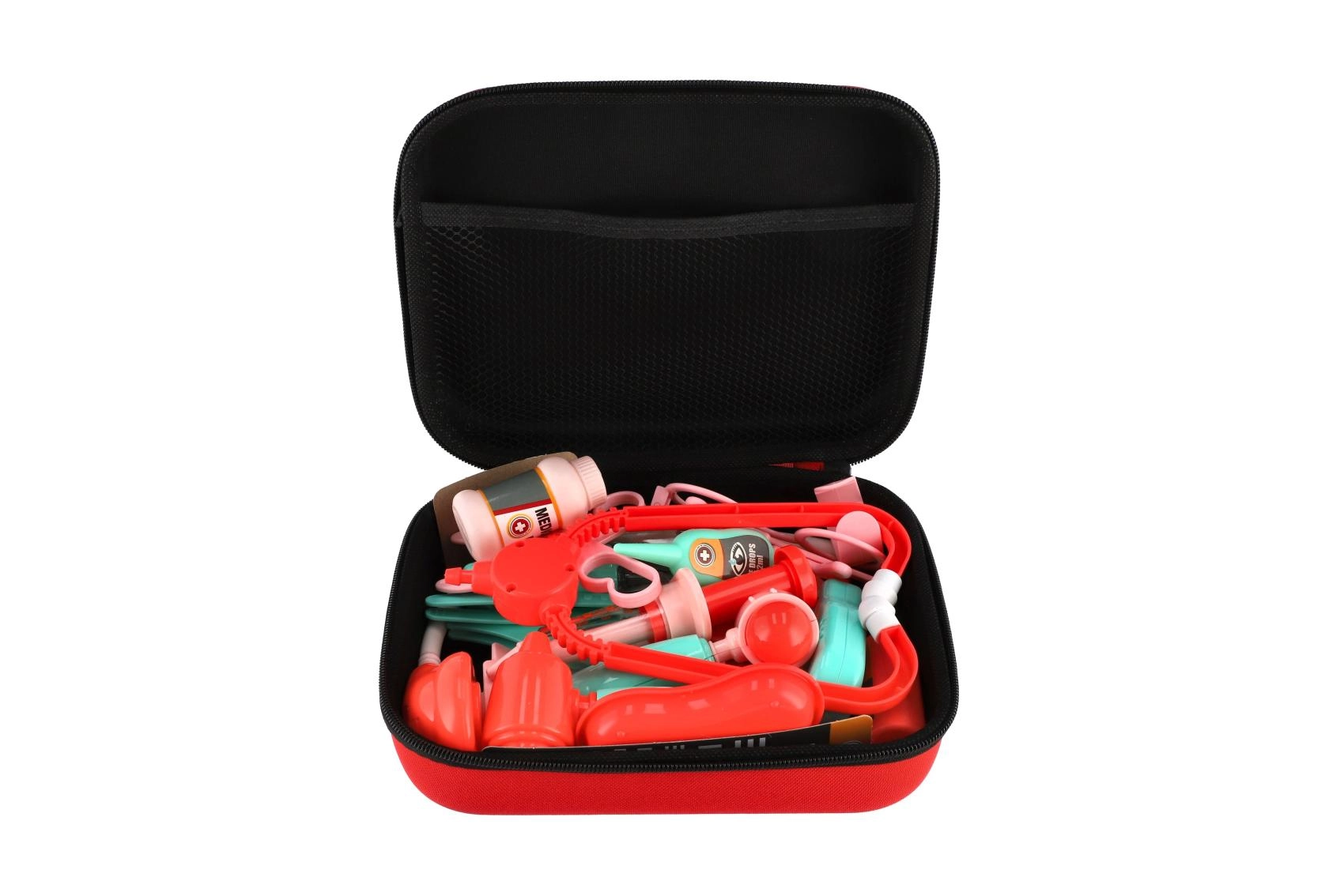 Stetoskop, sprøjte, otoskop, termometer og andet tilbehør gør det muligt for børn at lege komplette undersøgelser og behandlinger af “patienter”.