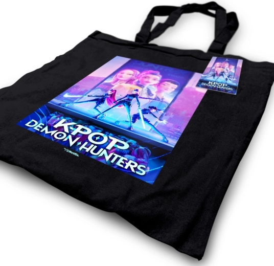 Vis din passion for K-pop Demon Hunters med denne praktiske og holdbare taske i sort lærred. Forsiden prydes af en iøjnefaldende, farverig grafik af hovedpersonerne i en dynamisk positur med neonblå og lilla accenter, som giver et moderne look og fanger opmærksomheden med det samme.