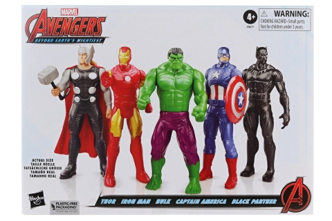 - 5 ikoniske helte i ét sæt: Thor, Iron Man, Hulk, Captain America, Black Panther