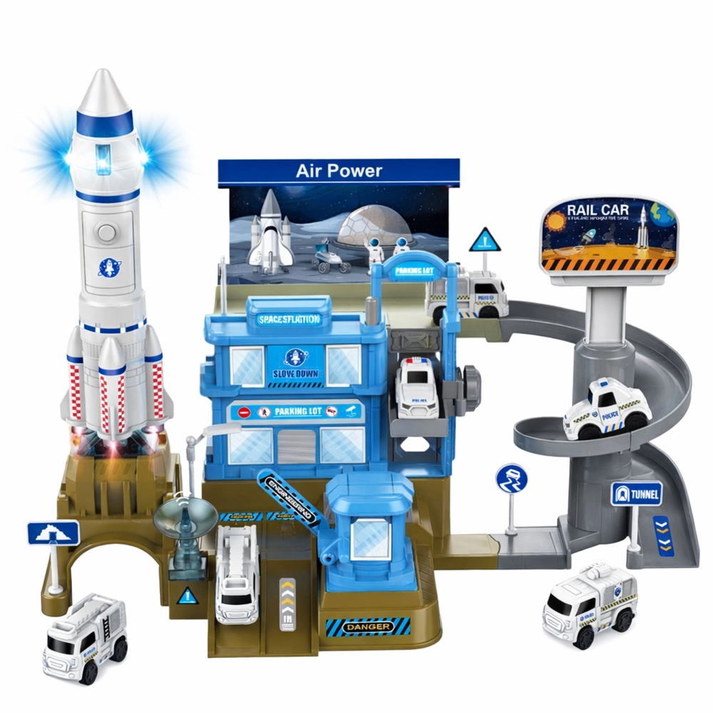 Oplev endeløs underholdning med børnenes rumstation med raket – et fleretagers sæt til små astronauter. Sættet inkluderer ramper, elevator, parkeringsplads og affyringsrampe. Den batteridrevne raket byder på lys- og lydeffekter, som gør opsendelsen til rummet maksimalt realistisk. Robust udførelse, rigt tilbehør og udvikling af kreativitet og motorik under legen.