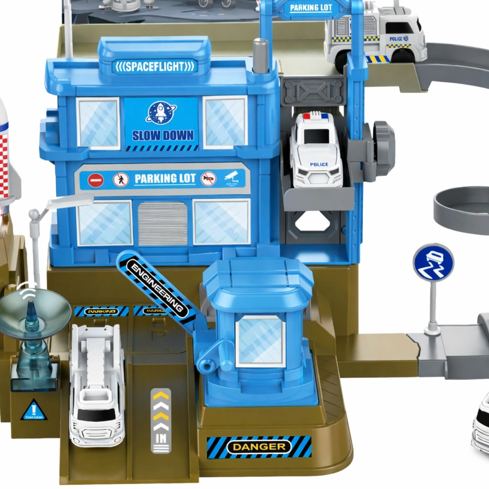 Den spiralsnoede rampe, porte og parkeringspladser muliggør jævn kørsel med køretøjer, manøvrering og realistiske scener fra en rumbase.