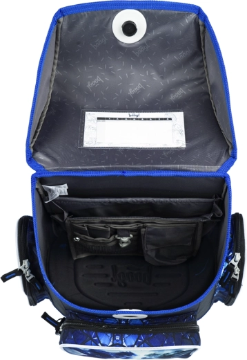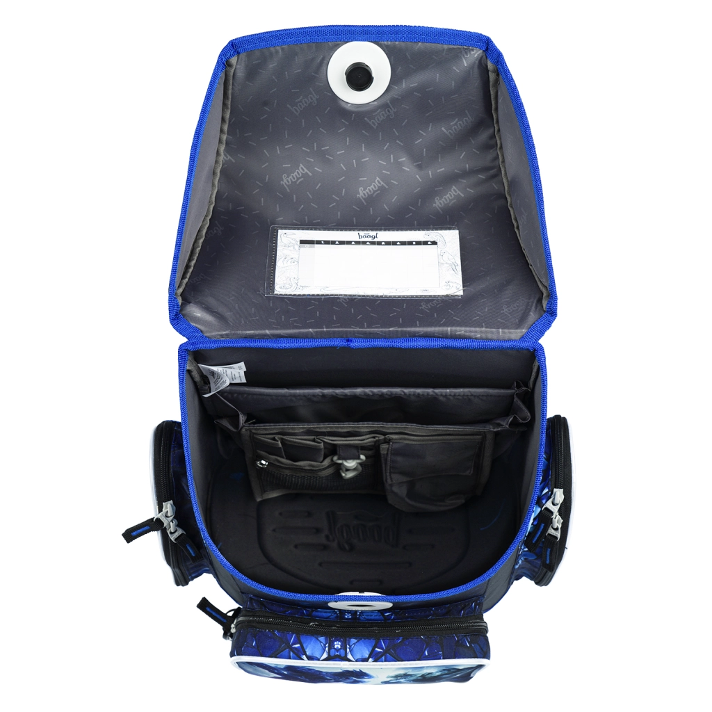 Praktisk indretning indvendigt med organizer, gennemsigtig lomme til skema, isoleret frontlomme og to sidelommer holder styr på tingene. Sættet fuldendes af et etagers penalhus (uden indhold) med YKK-lynlås, en holdbar snørepose til ryggen med karabinhage til fastgørelse på tasken, et aftørringsvenligt børneforklæde med to lommer og en pung til halsen med navnemærke og sikkerhedslås på snoren.