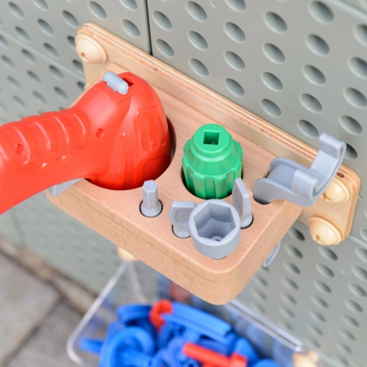 Inkluderer børneboremaskine, skruetrækker og nøgle til ægte skruarbejde, gennemsigtige bakke-organisatorer, farverige pinde og skruer, tandhjul med kæde samt en modulær kuglebane. Det modulære system opmuntrer til selvstændige eksperimenter og udvikler øje–hånd-koordination, præcision og skaberglæde.