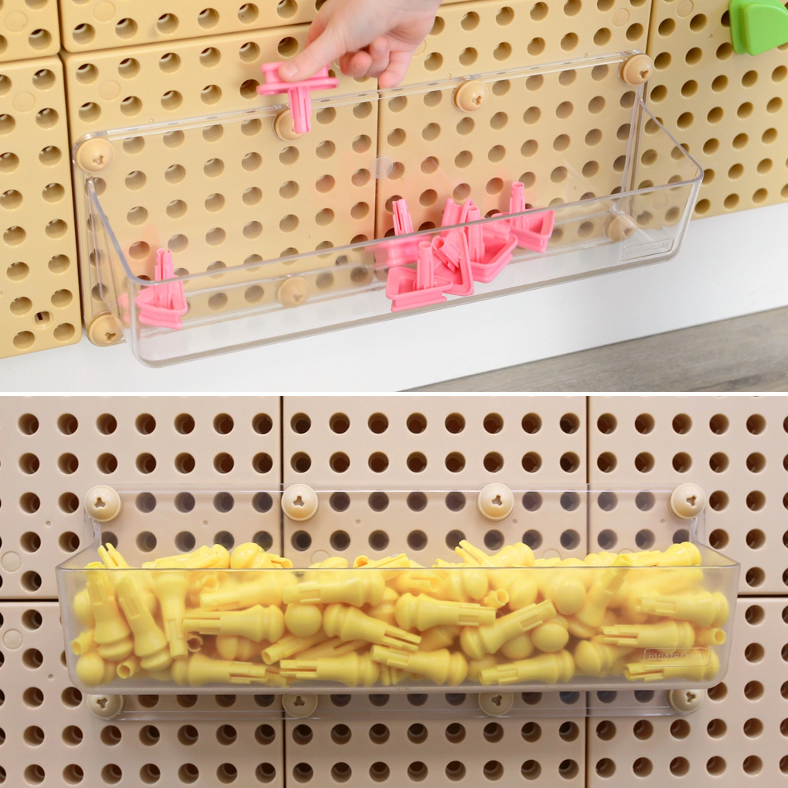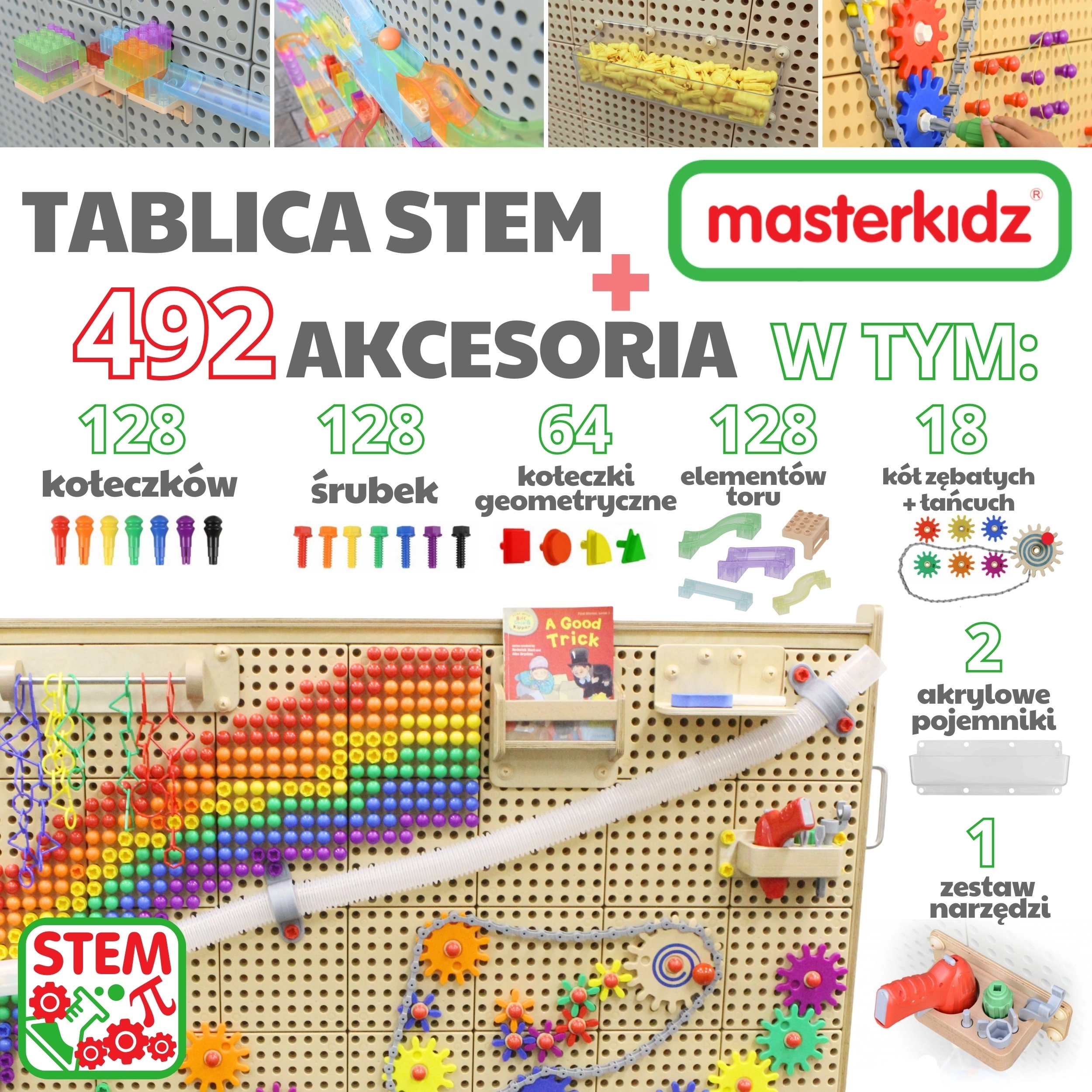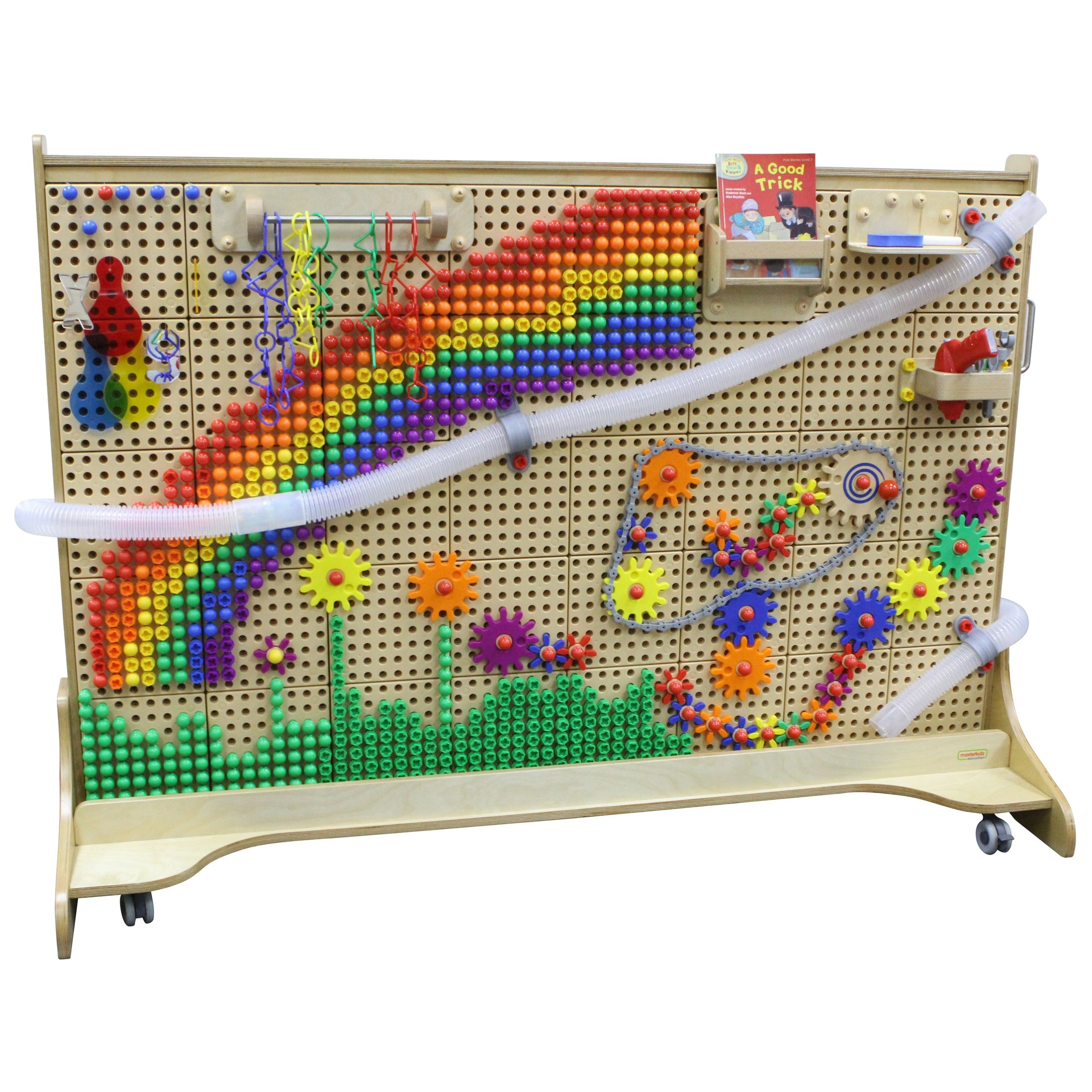Dette komplette STEM-sæt tilbyder en robust perforeret plade på hjul, der fungerer som byggestation for tandhjul, skruer, pinde, kuglebaner og kreative mosaikker. Med det rige udvalg af tilbehør forstår børn let principperne for årsag og virkning, mekanik og fysik.