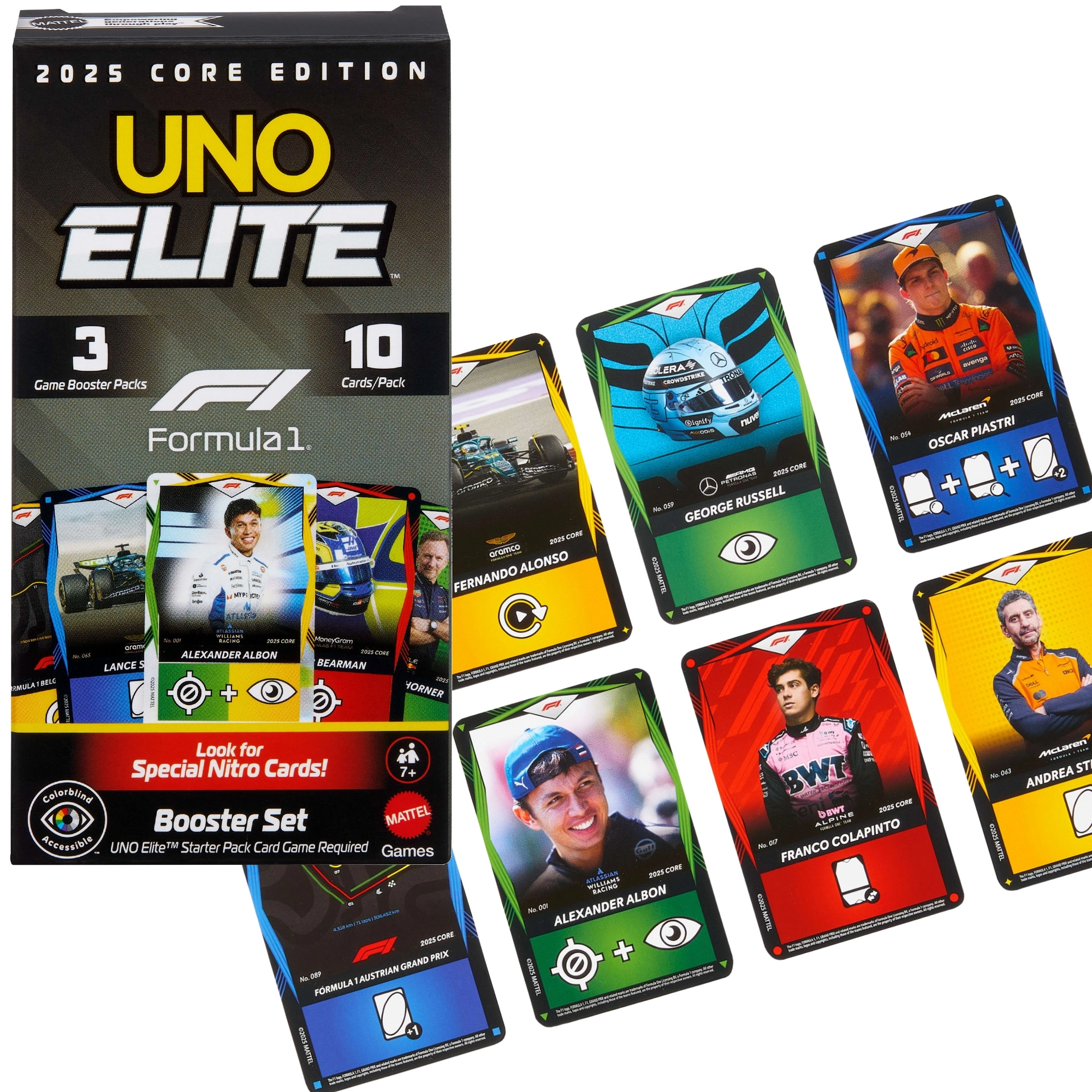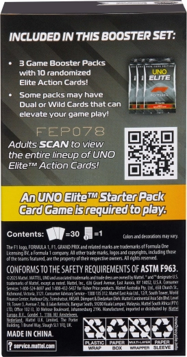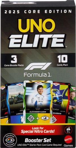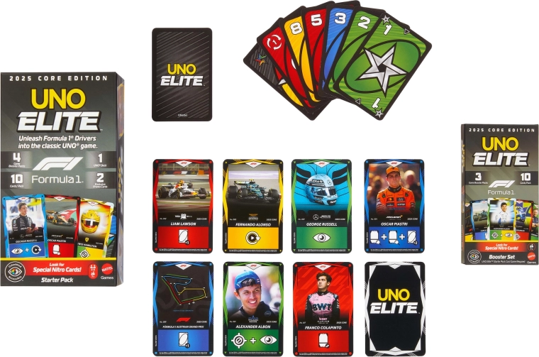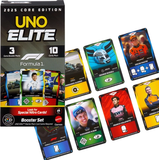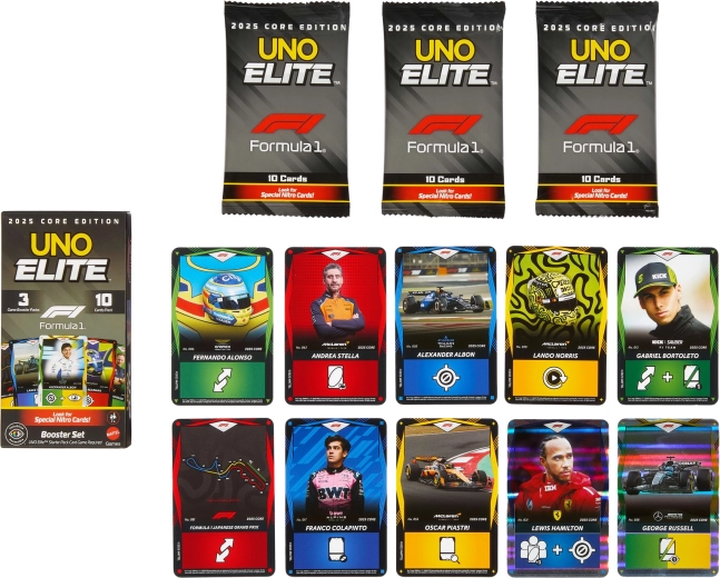 Træd ind i racetempoet med udvidelsen UNO Elite Formula 1 2025. Hver Booster Pack bringer tilfældigt udvalgte kort med motiver af F1-kørere, racerbiler, hjelme og baner. Særlige Elite-kort aktiverer deres evner, når der lægges et kort med Elite-ikon i samme farve, hvilket giver nye strategier og spændende øjeblikke i hver runde.