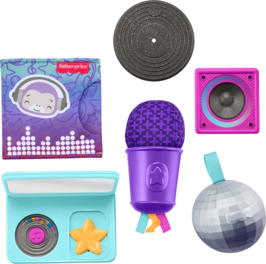 Pivelydende mikrofon, disco-rasle, silikone “højttaler”, bideplade og knitrende etui skaber et sjovt, musik-inspireret sæt til sanselig udforskning og rolleleg.
