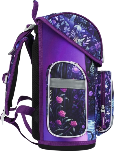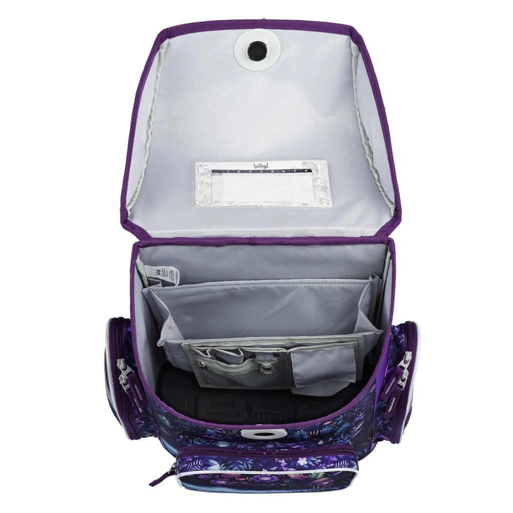 Magnetisk Fidlock-lukning for hurtig betjening, isoleret frontlomme, to sidelommer til flaske og indvendig organizer med skema for perfekt overblik.