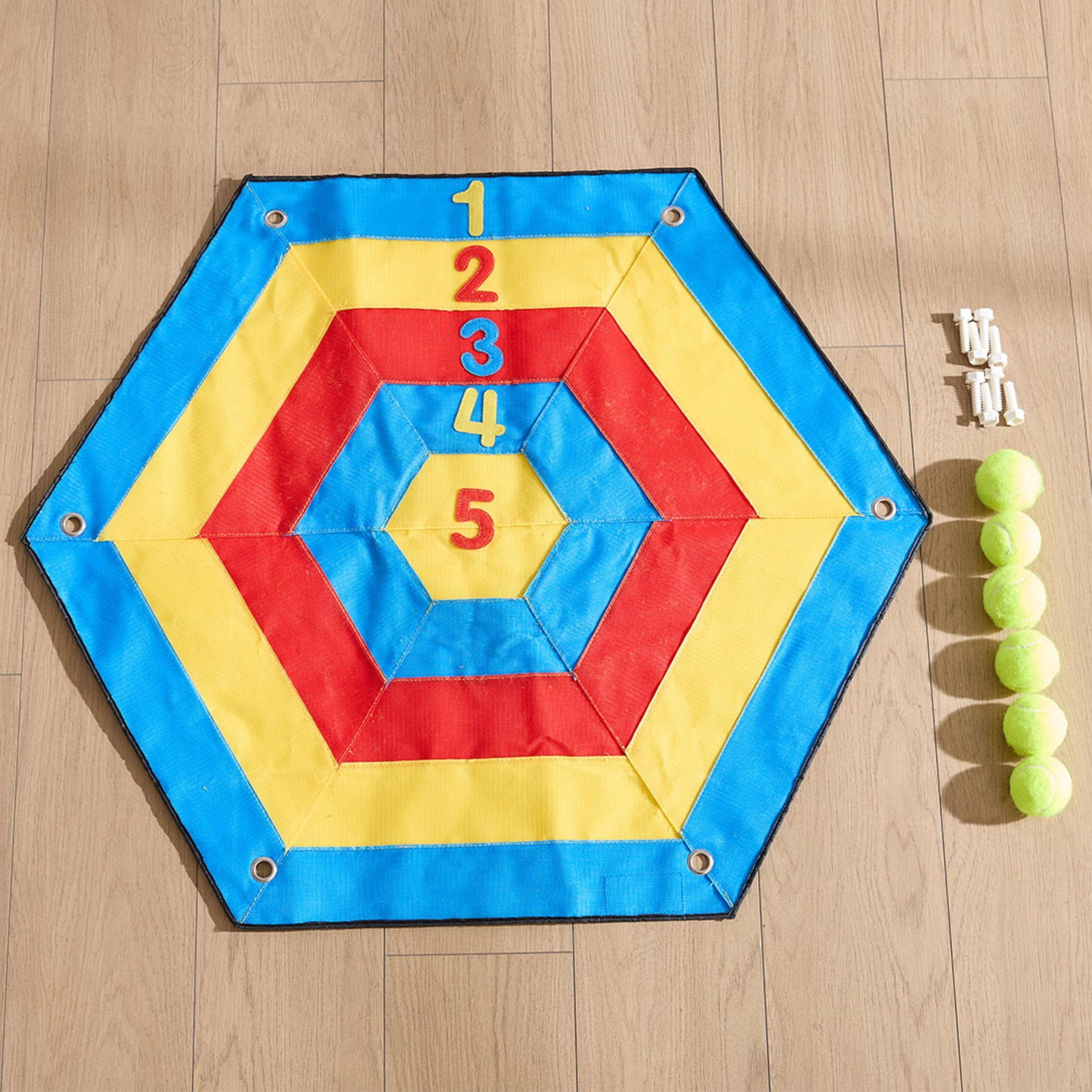 Gør taltræning til et actionfyldt eventyr. Den store sekskantede målskive med ophængsøjer er designet til sikker og fængende leg: Børn kaster bløde velcrokugler på de nummererede felter og samler point. Den lette konstruktion gør det nemt hurtigt at hænge den op på en væg eller tavle og at bruge den udendørs.