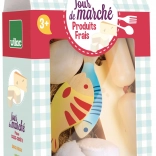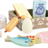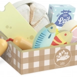 Alle dele er omhyggeligt fremstillet af træ, hvilket sikrer deres holdbarhed og sikkerhed under leg. Børnene kan nyde realistisk leg, mens de lærer om madvarer og deres anvendelse.