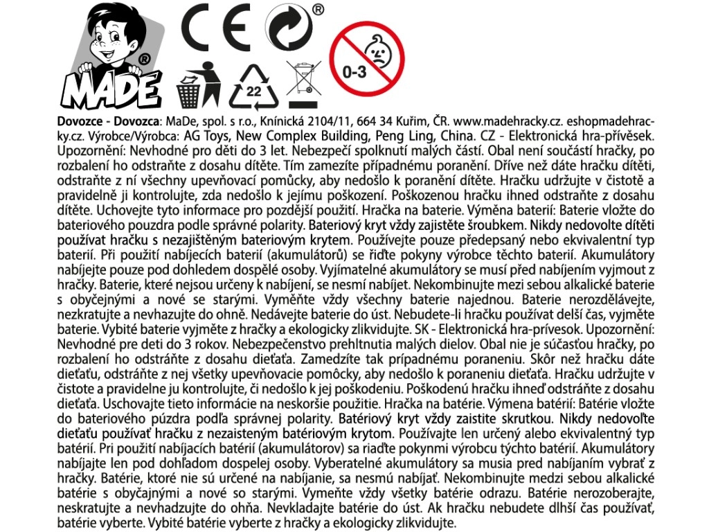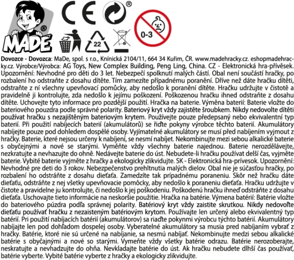 Spillet er klar til brug med det samme takket være to LR44-batterier, som følger med i pakken. Et godt valg til leg derhjemme og udendørs, på rejser, i venteværelser eller i børnehjørner.