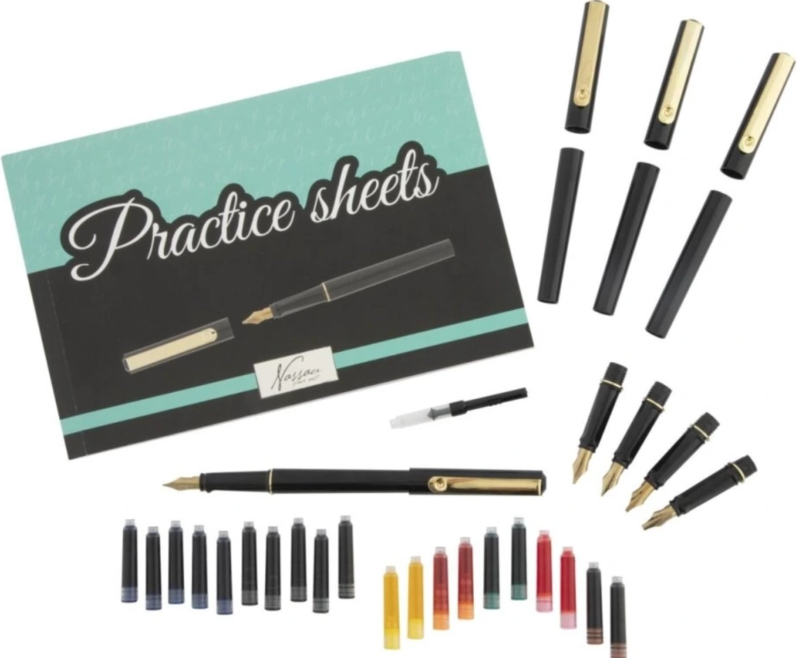 I pakken finder du alt, hvad du behøver til både træning og færdig produktion – fra fem elegante penne og udskiftelige spidser til et praktisk øvehæfte til gradvis forbedring af teknikken. Sættet er designet til komfortabel skrivning, jævn blækgennemstrømning og rene linjer.